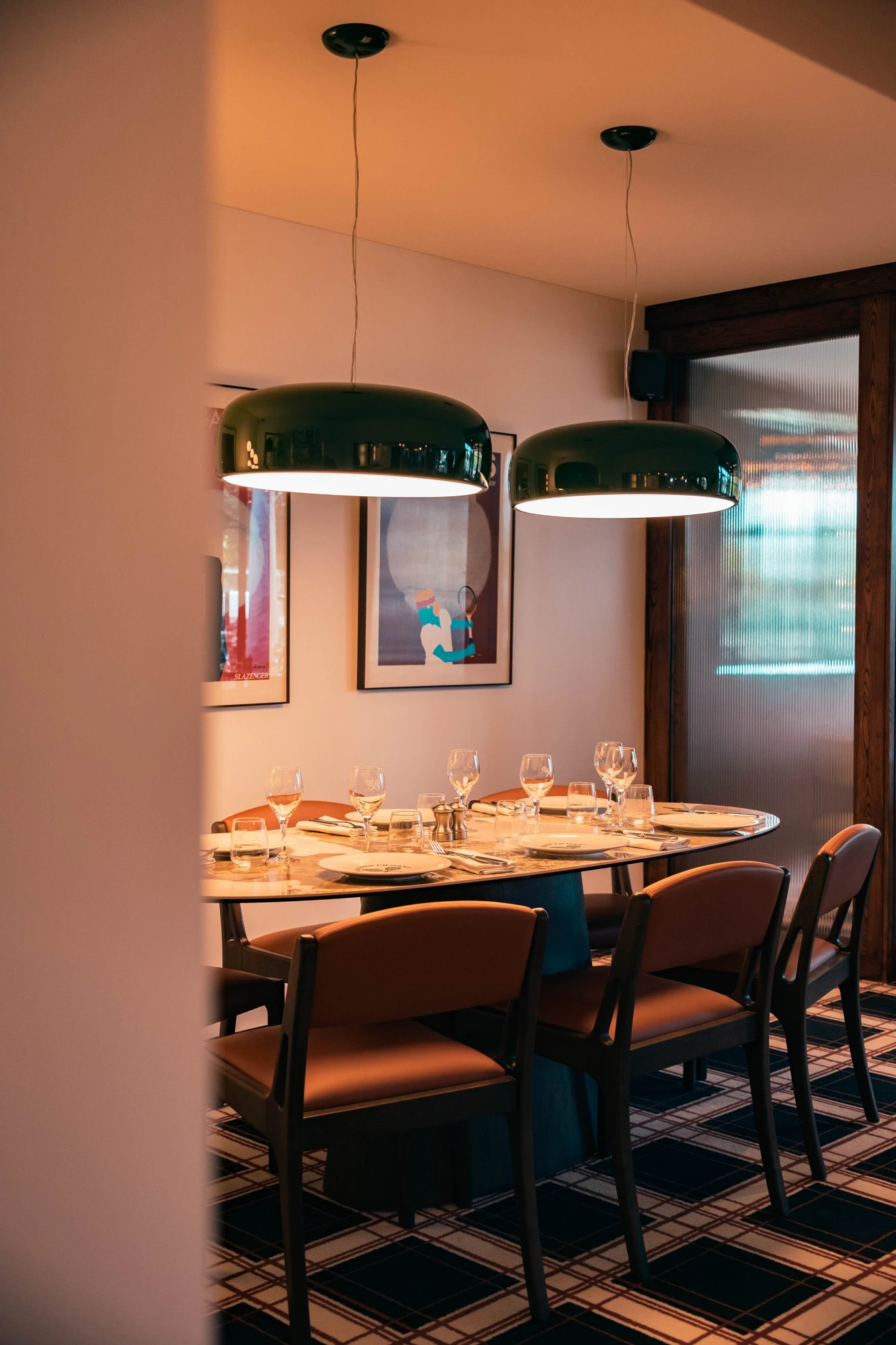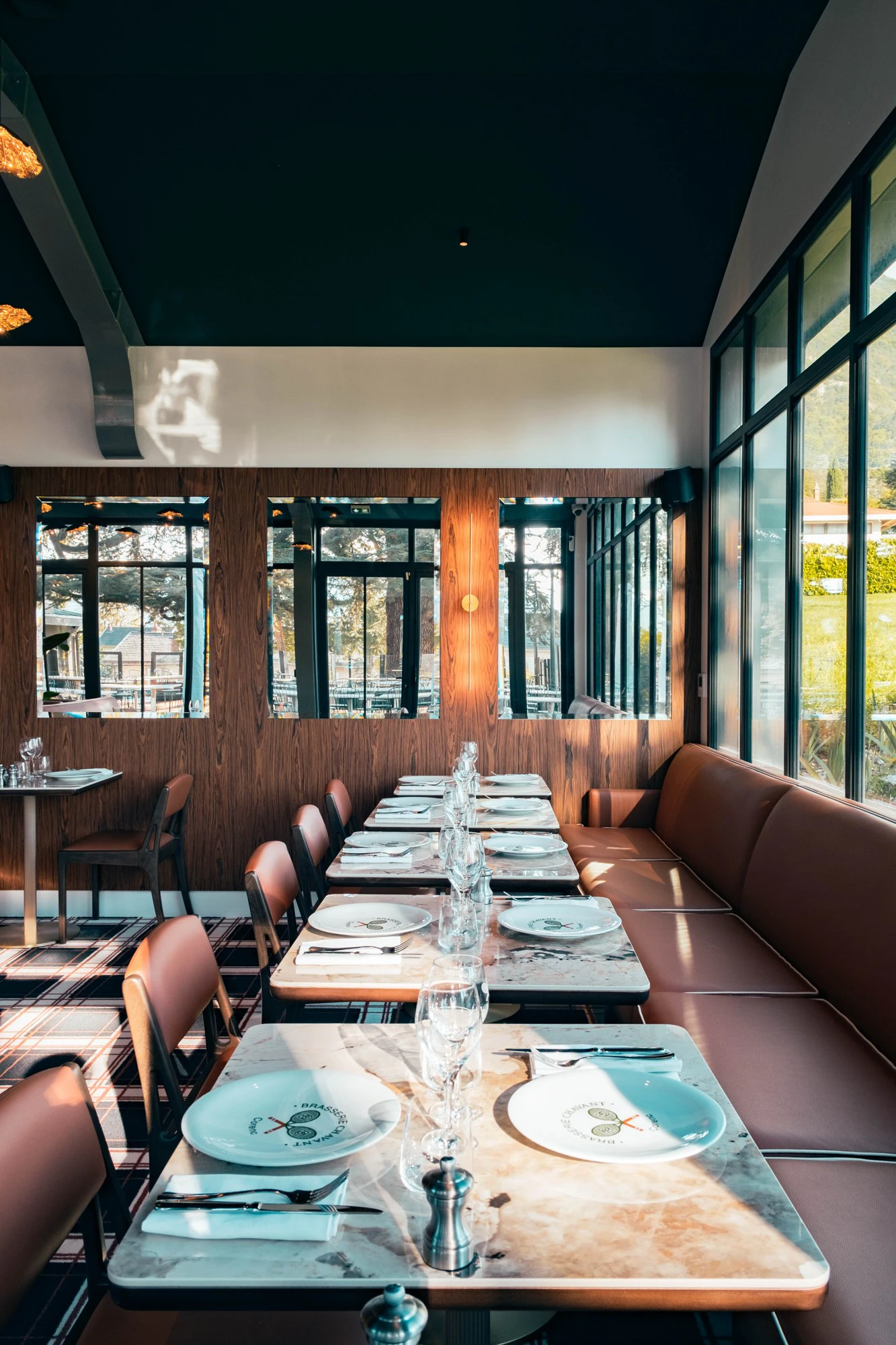 Across both the indoor and outdoor spaces, a clear design narrative emerges: a palette of deep greens, warm woods, graphic tartans, and subtle references to the world of tennis clubs. Vintage Roland-Garros posters, caramel-toned banquettes, brass lighting, and expansive windows create a warm, immersive atmosphere where each detail contributes to the identity of the place.