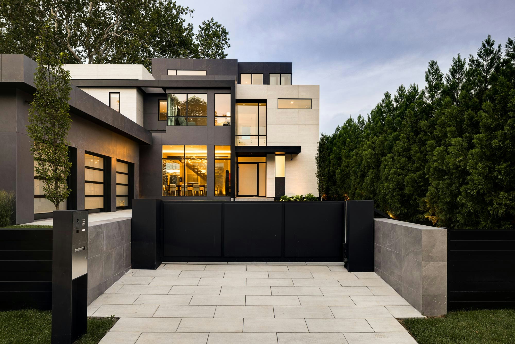 The design called for a layered visual effect, combining multiple Dekton colors - Kelya, Marmorio, and Domoos - to create depth and contrast in the home’s exterior. This blend of dark and cream tones played beautifully against the natural backdrop while complementing the oversized windows and doors that define the home’s front and rear elevations.
