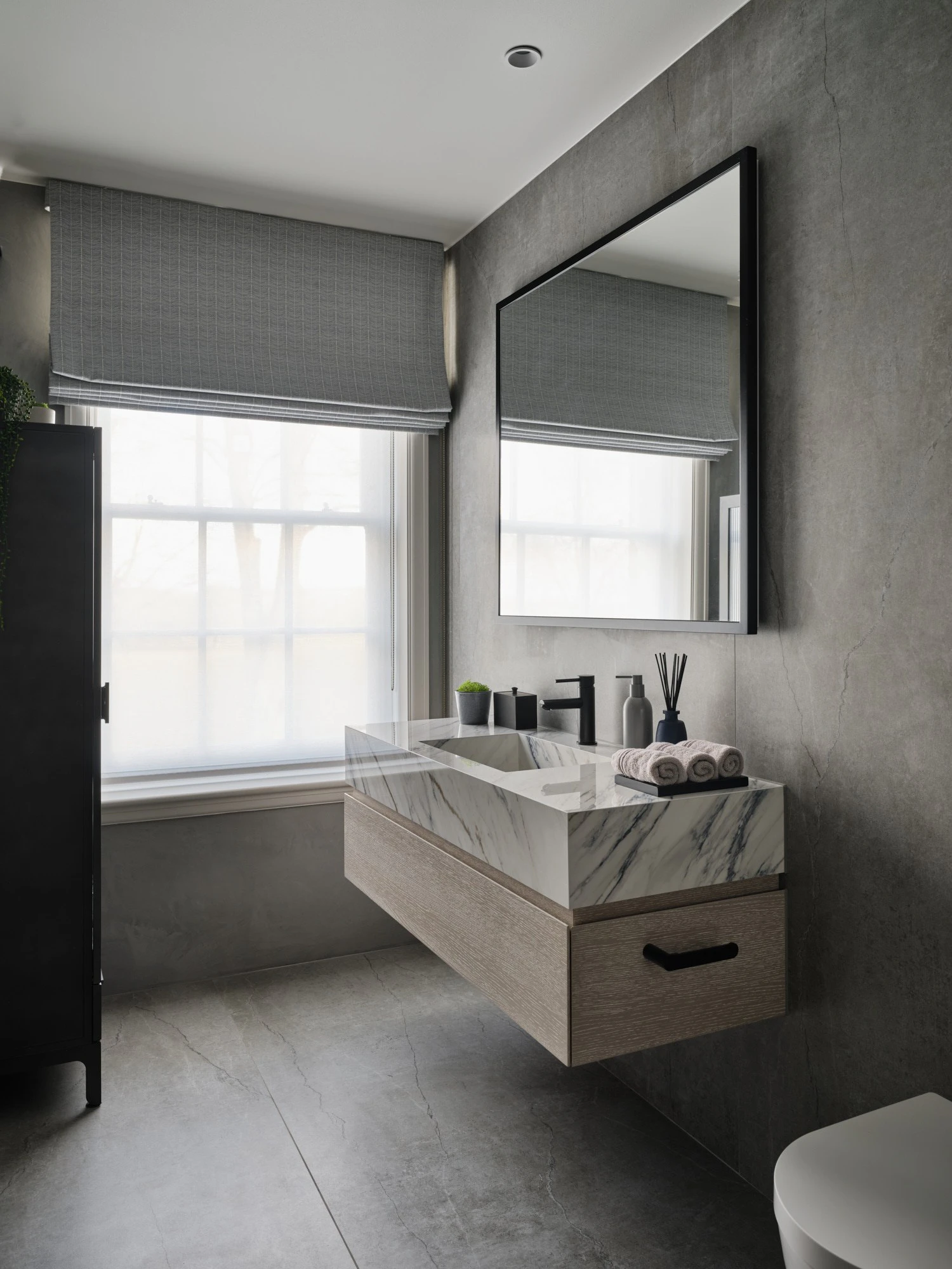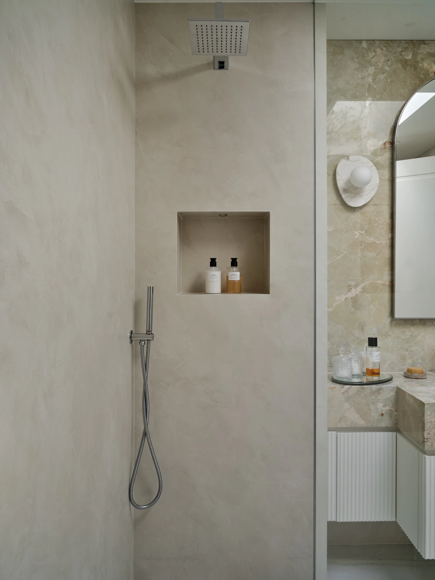 The use of Dekton ensures wear-resistant surfaces that are easy to maintain and suitable for wet and high-traffic areas, while Sensa introduces the beauty of natural stone with protection designed for everyday life. This combination allows the home to function without ever compromising on a polished and cohesive appearance.