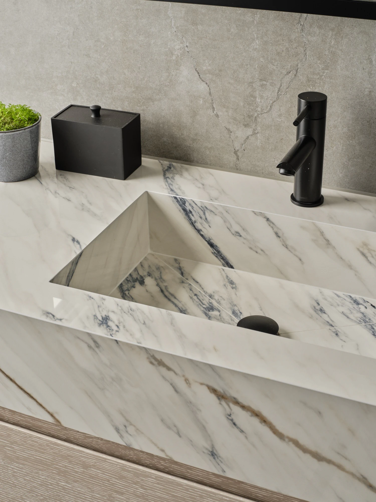 Each bathroom is personalised through the choice of tones and textures: Dekton Neural and Dekton Albarium in Carlotta's bathroom; Dekton Morpheus on the floor and sink in Valentina's bathroom; and Dekton Laurent on the floor and shower area in the guest bathroom, combined with Dekton Awake on the sink. In the cinema room, Dekton Laurent reappears as a furniture surface. Pure material continuity and durability.