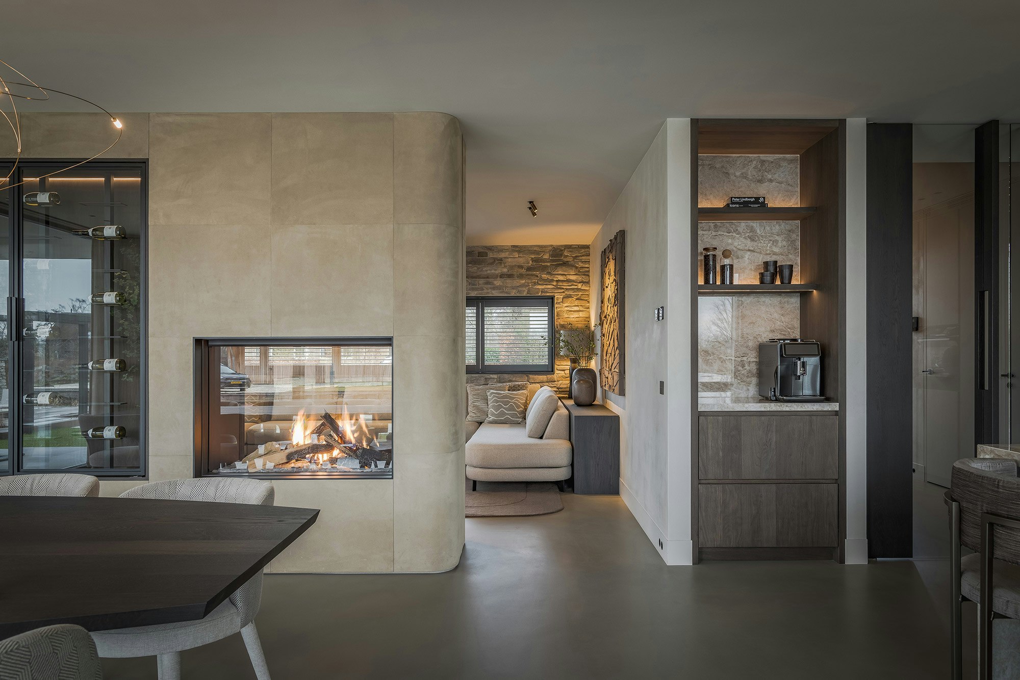 The layout of the villa is open and practical. The living room and kitchen are separate spaces, but the open connection between the two is beautifully enhanced by a see-through fireplace. The interior is largely furnished with custom-made furniture, using materials such as stained wood, leather, suede, and linen. In the kitchen, Dekton is used again as a countertop and backsplash, a versatile and practical material that perfectly matches the rest of the interior. Here, the color Taga is applied.