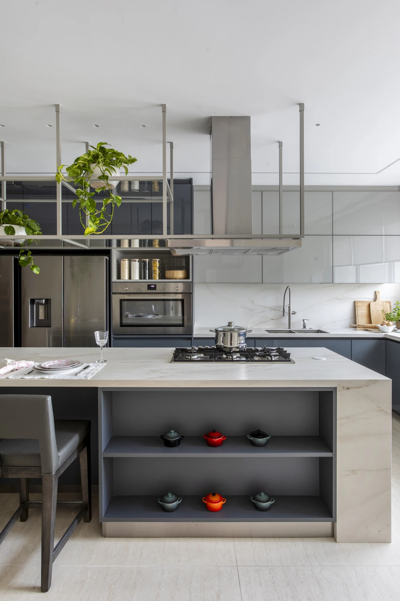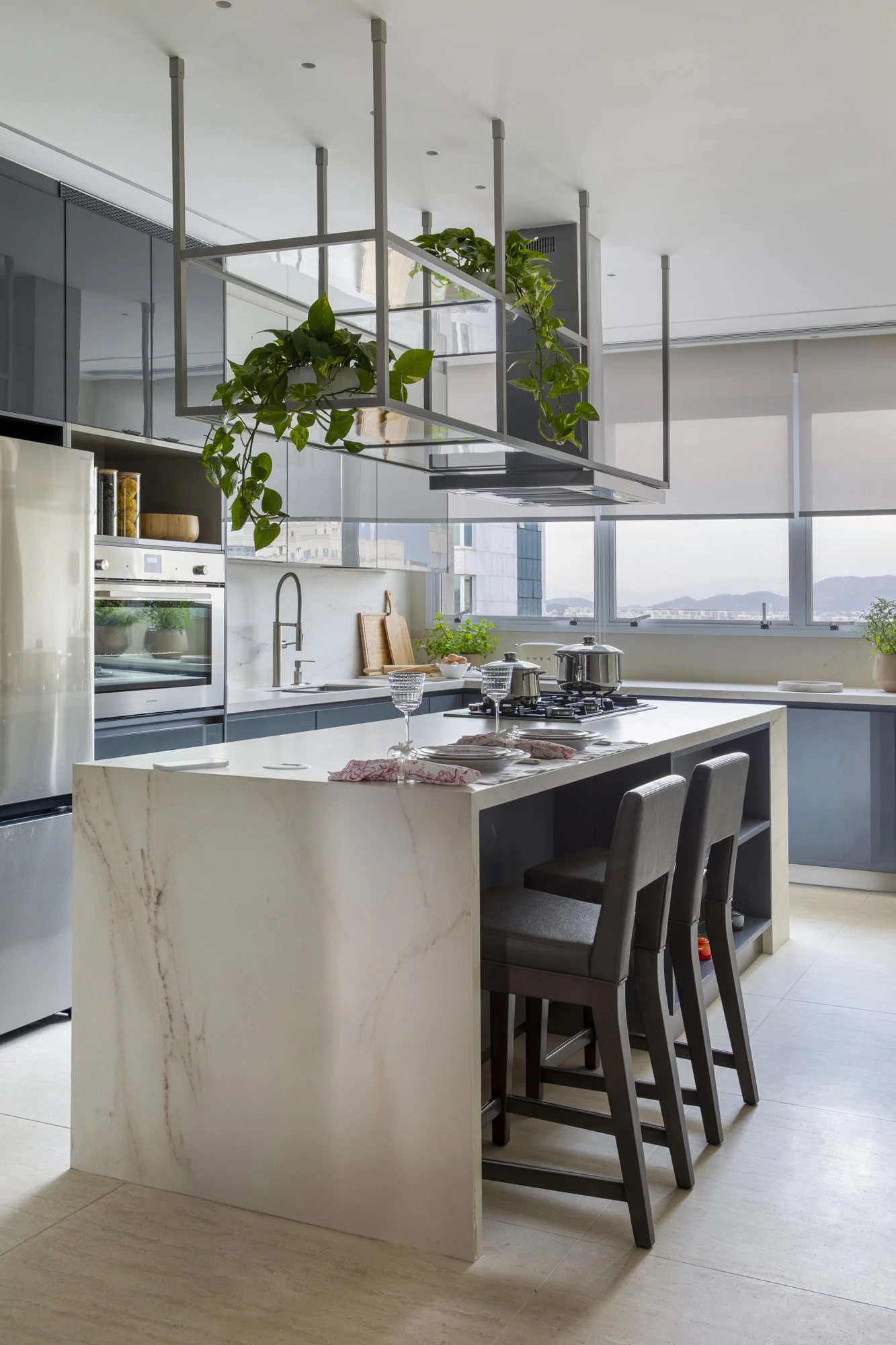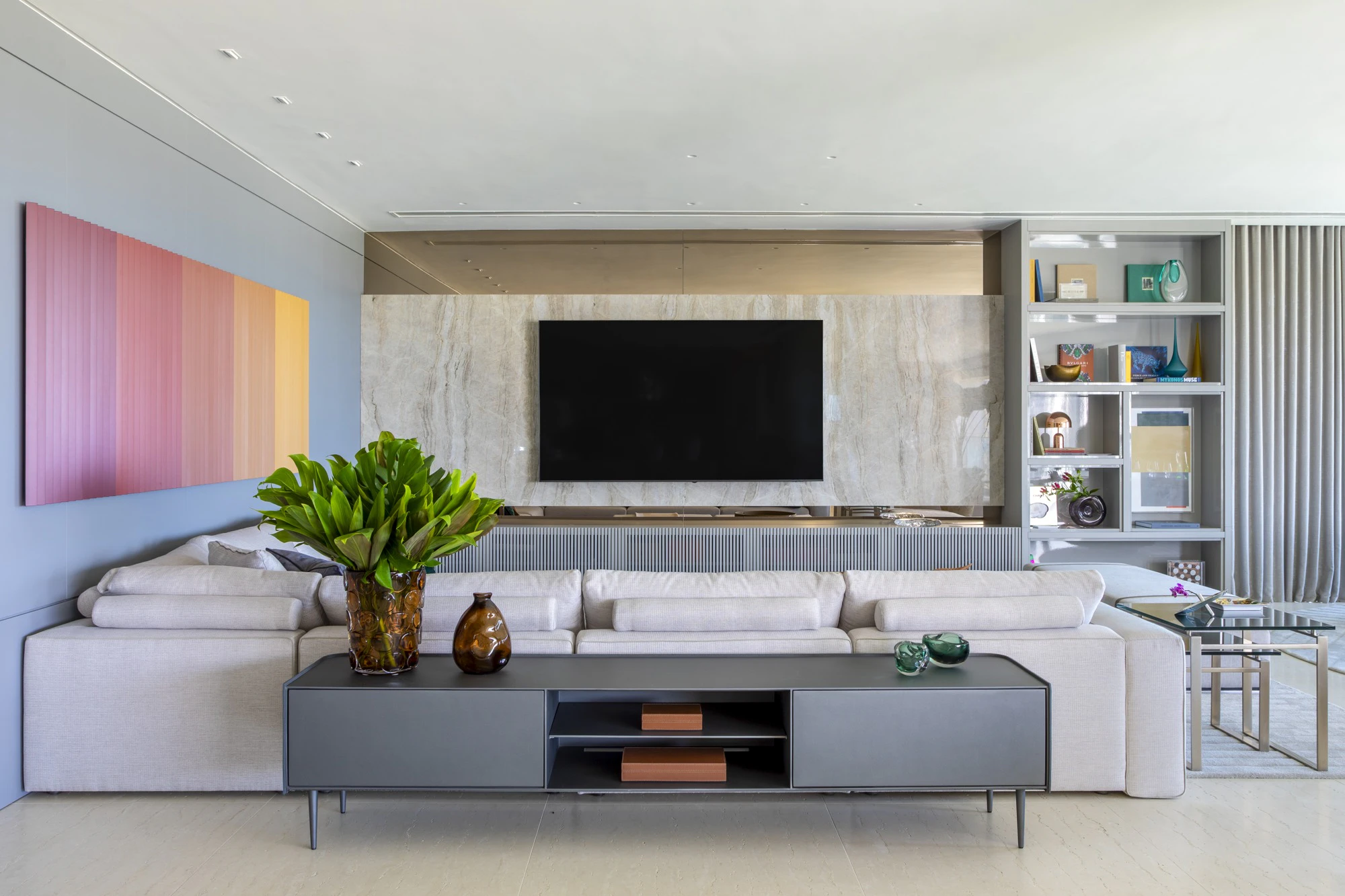 The interior design project began by highlighting the privileged view, which became a central element of the architectural proposal. To enhance this connection with the surroundings, the architect integrated the balcony into the living room and organised the social area into different zones: living room, dining room, TV room, lounge, and gourmet space, creating a continuous and balanced flow. One of the standout features of the layout is the spacious climate-controlled wine cellar, designed not only as a functional area but also as a space for socialising and contemplation.