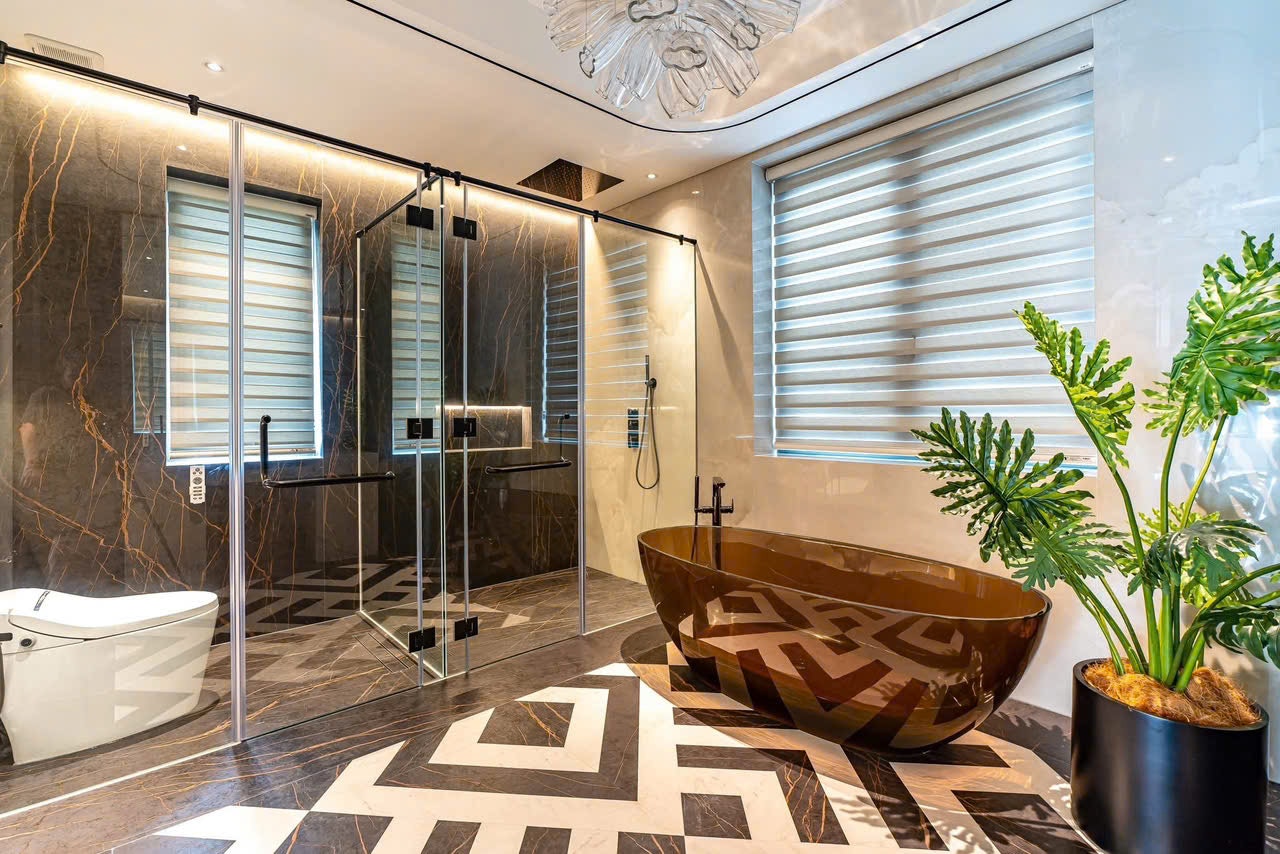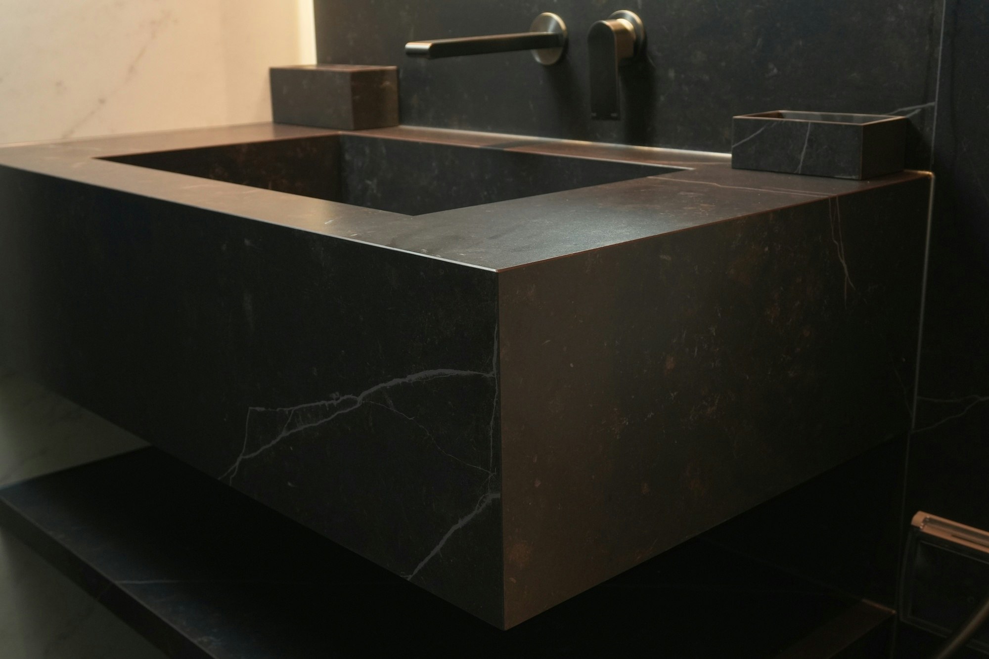 “In the bathroom, the flooring stands out for its artistic composition made with contrasting Dekton slabs, creating a modern layout with great visual impact. As a complement, a freestanding monolithic Dekton washbasin and a bespoke Dekton toothbrush holder showcase exceptional craftsmanship and strong material coherence. Together, these elements form a luxurious and continuous space, becoming one of the defining aesthetic highlights of the entire project,” the studio explains. Both the bespoke washbasin and toothbrush holder demonstrate the versatility and artistic possibilities of Dekton, as well as the meticulous work of Eurostone.