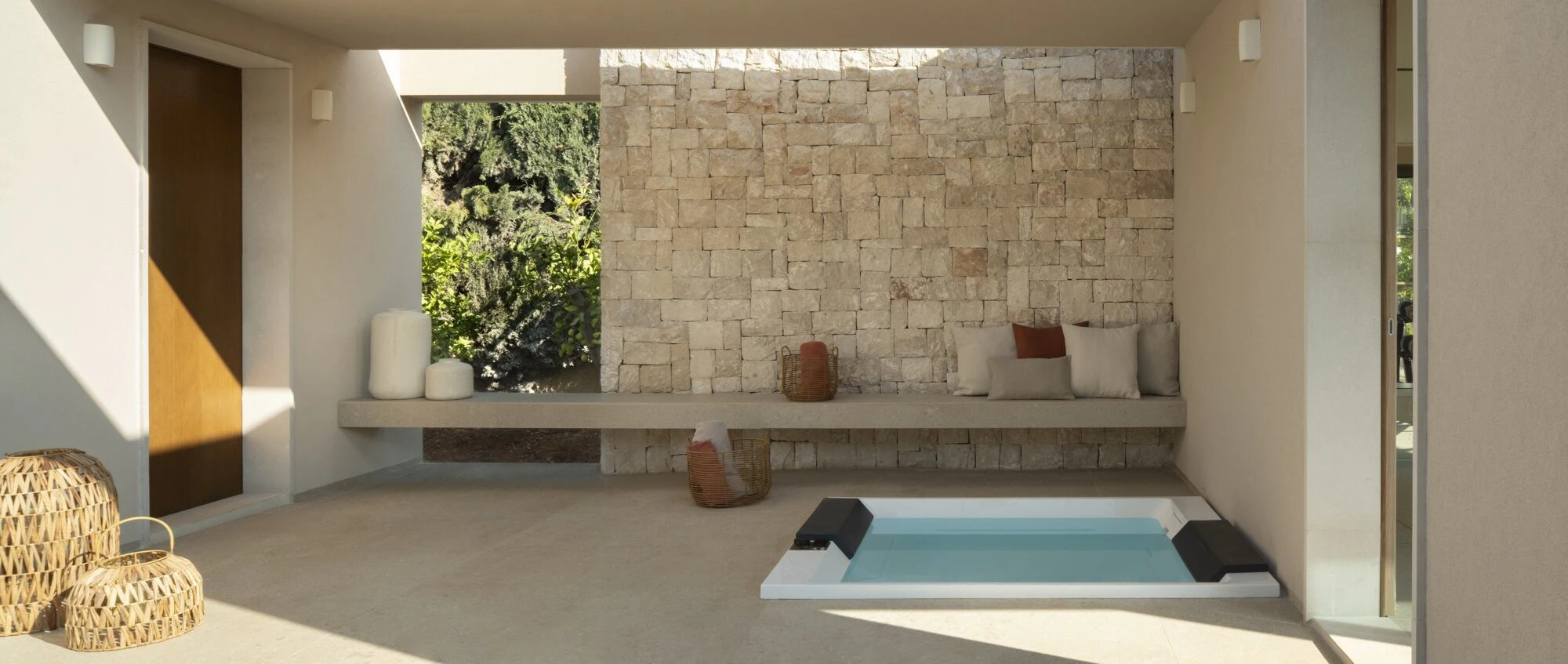 This continuity is particularly visible in the porch and solarium area, where the interior flooring extends to the garden and integrates with the landscape. The material's stability against solar radiation and temperature changes typical of the Mallorcan climate was crucial for its application in these areas.