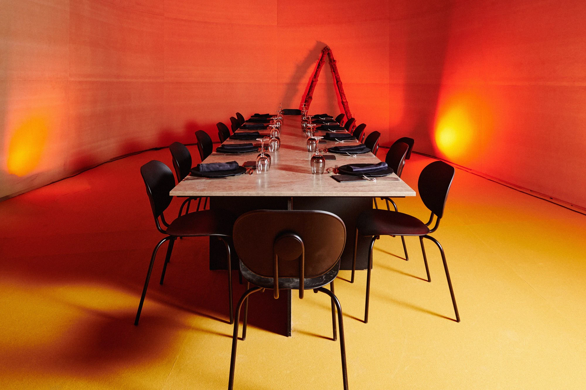 El espacio se completa con seis mesas modelo Eidos de Actiu, revestidas con Dekton Laurent. El contraste entre el fondo oscuro y las vetas doradas del material introduce una dimensión más intensa y gráfica dentro de la paleta general.