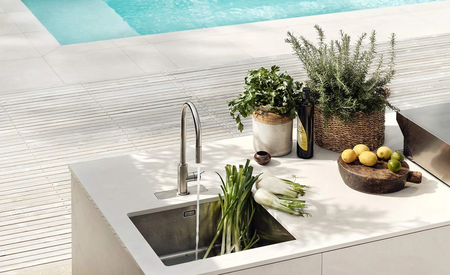 En una cocina exterior, el material no puede ser solo estéticamente atractivo. Tiene que aguantar sol, humedad, cambios de temperatura, manchas, grasa, vino, cítricos, limpieza frecuente… y seguir luciendo como el primer día.