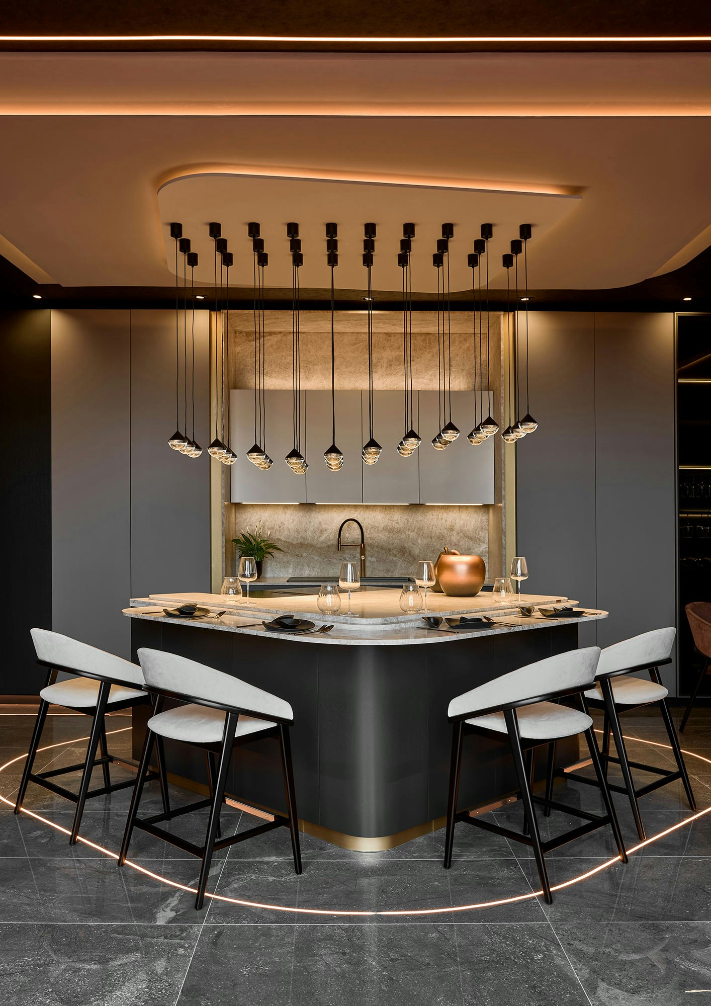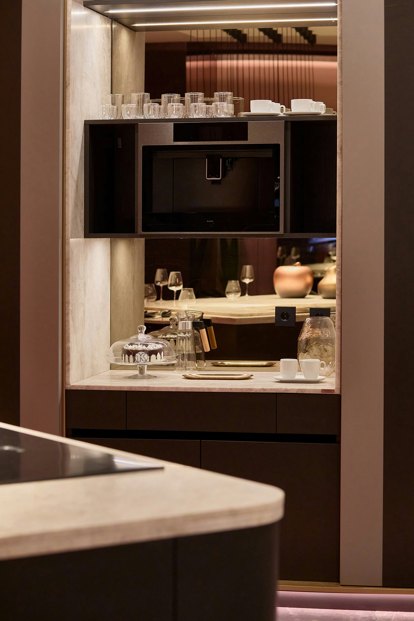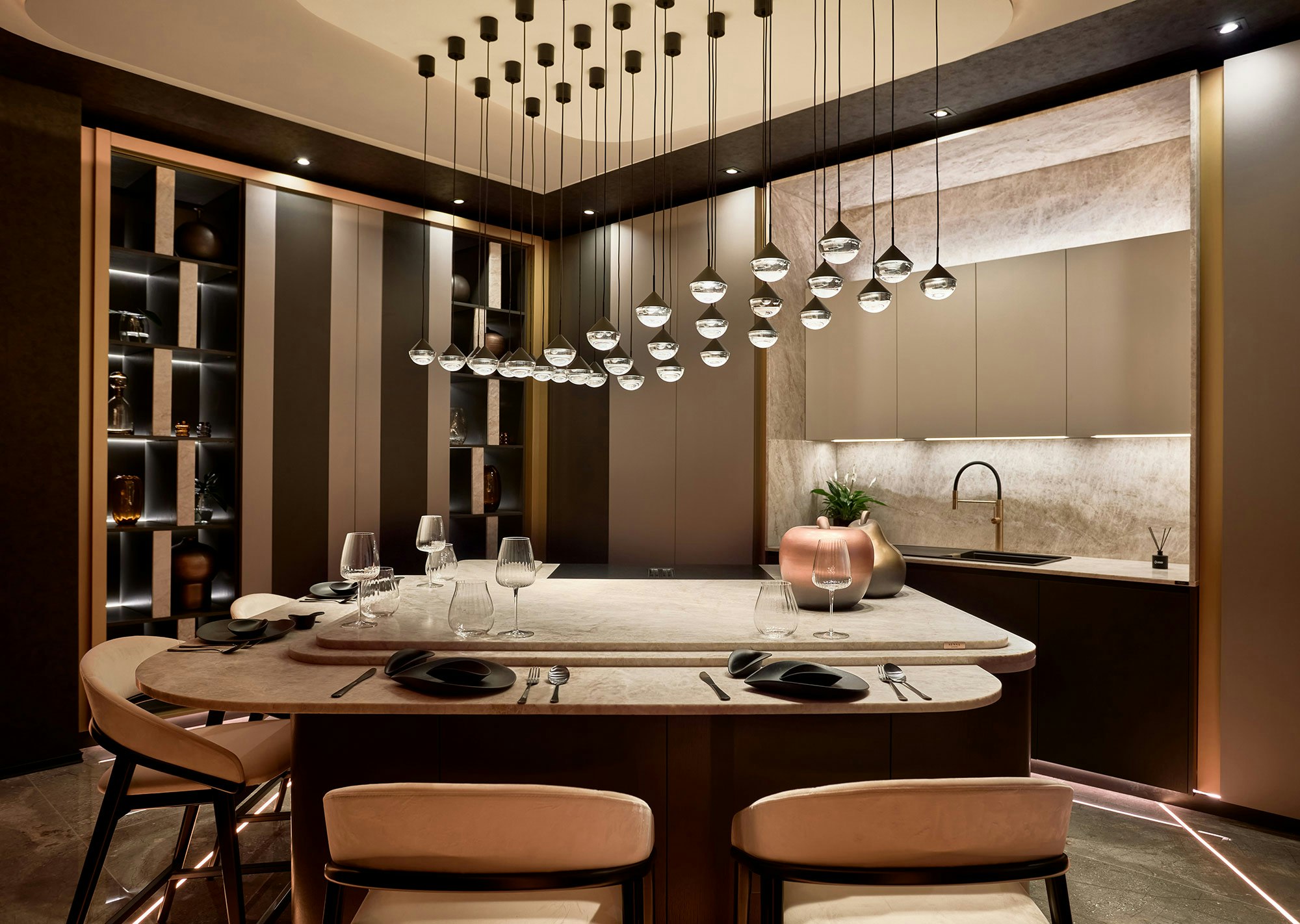 Para las encimeras e isla de este espacio de Inko Cocinas en MIAD 2025, Cynthia Román eligió Sensa Taj Mahal de Cosentino.