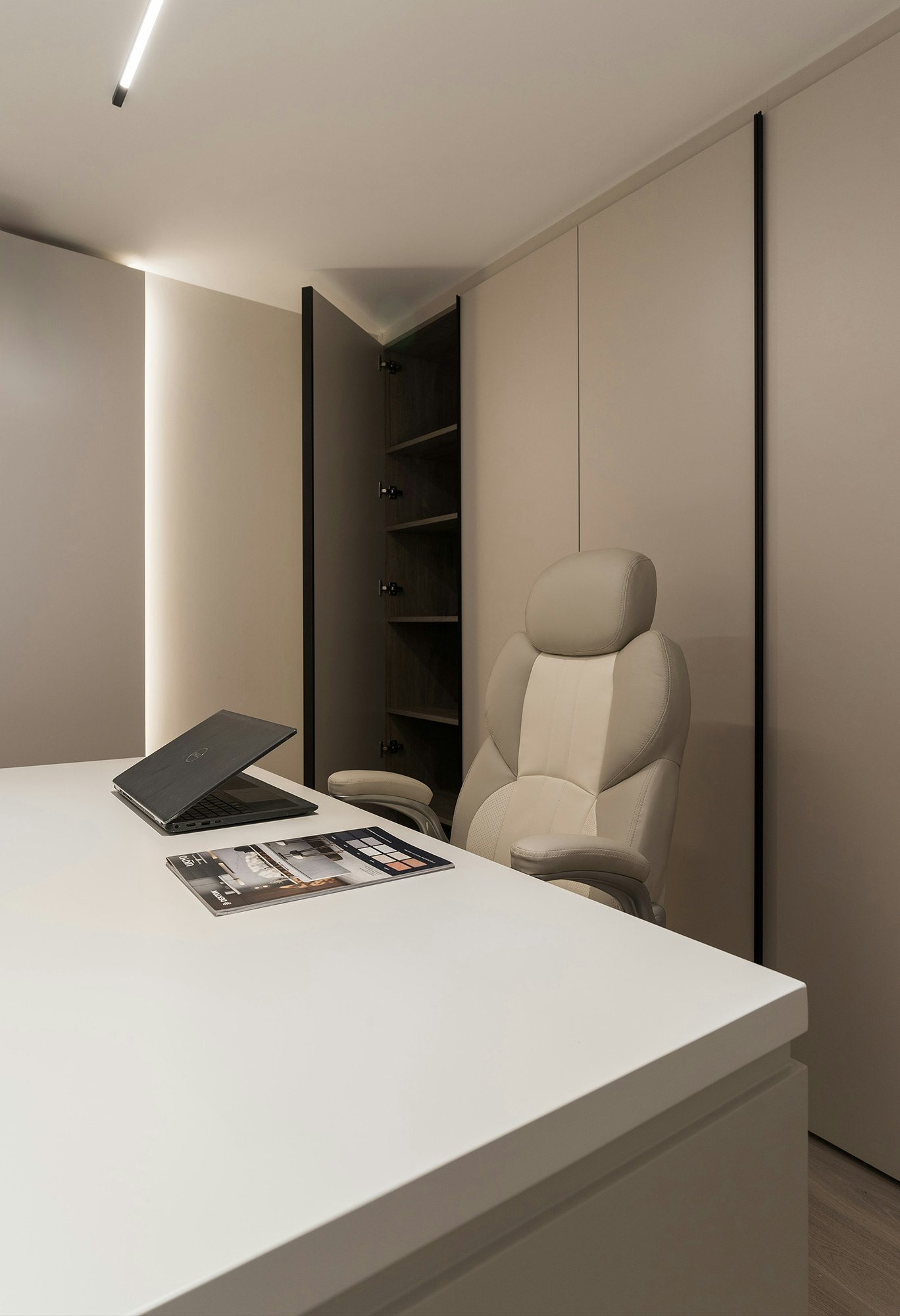 En esta oficina en Madrid, la diseñadora también eligió materiales de Cosentino por su resistencia y durabilidad.