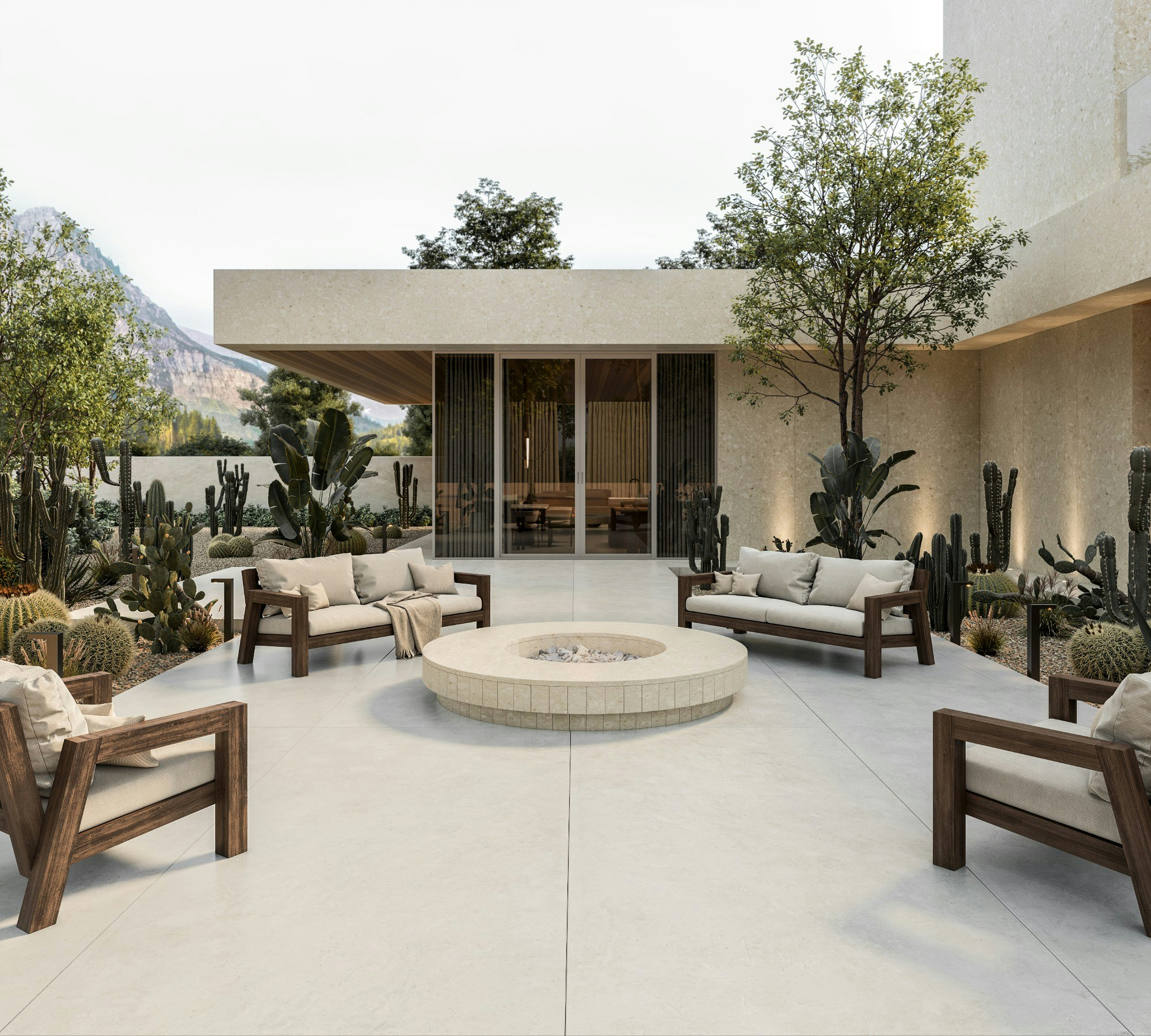 La superficie suave de Sandik invita al tacto, una característica clave en la tendencia Refugio, donde la experiencia háptica es tan importante como la visual. Este tono refuerza la sensación de seguridad y cuidado, ideal para interiores y exteriores que buscan transmitir calma absoluta.