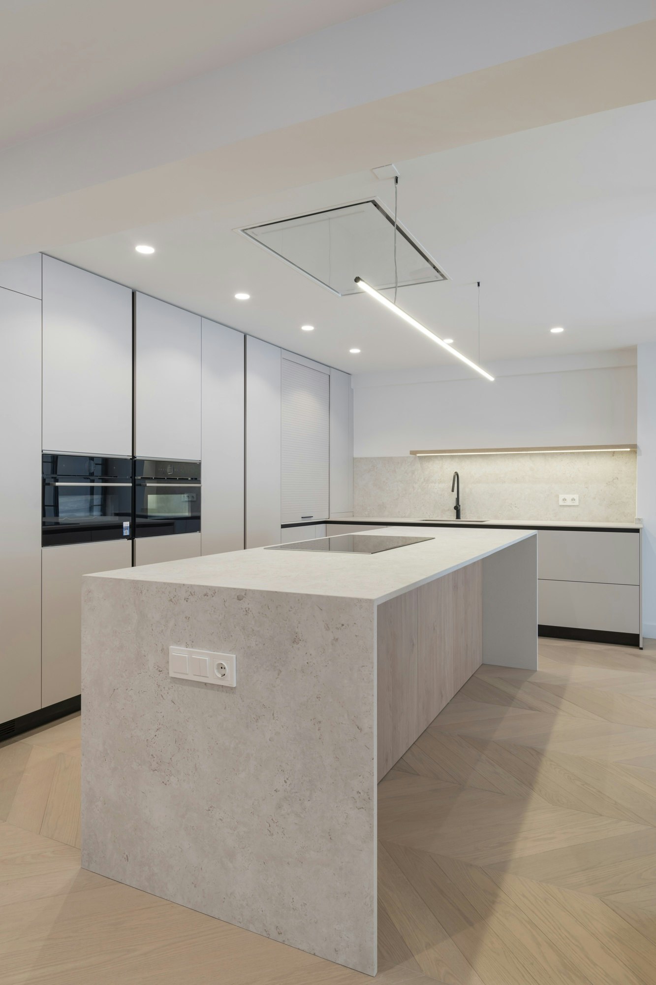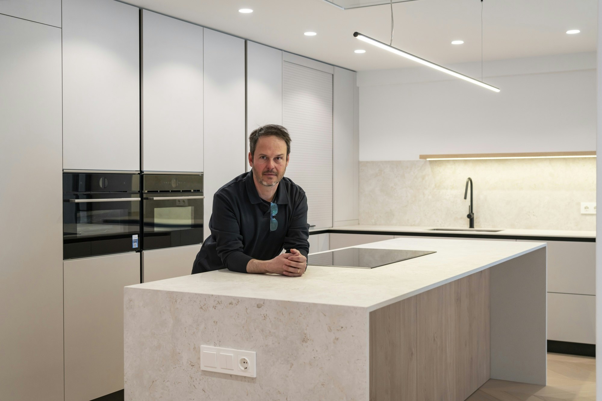 El corazón de la vivienda es la cocina, dominada por una isla de casi tres metros que funciona tanto como desayunador como área de trabajo. Este elemento se concibe como una pieza escultórica en diálogo directo con el salón. Para su acabado, ARQ4U eligió Dekton Sabbia, cortado a través para resaltar su porosidad natural sin comprometer la higiene.