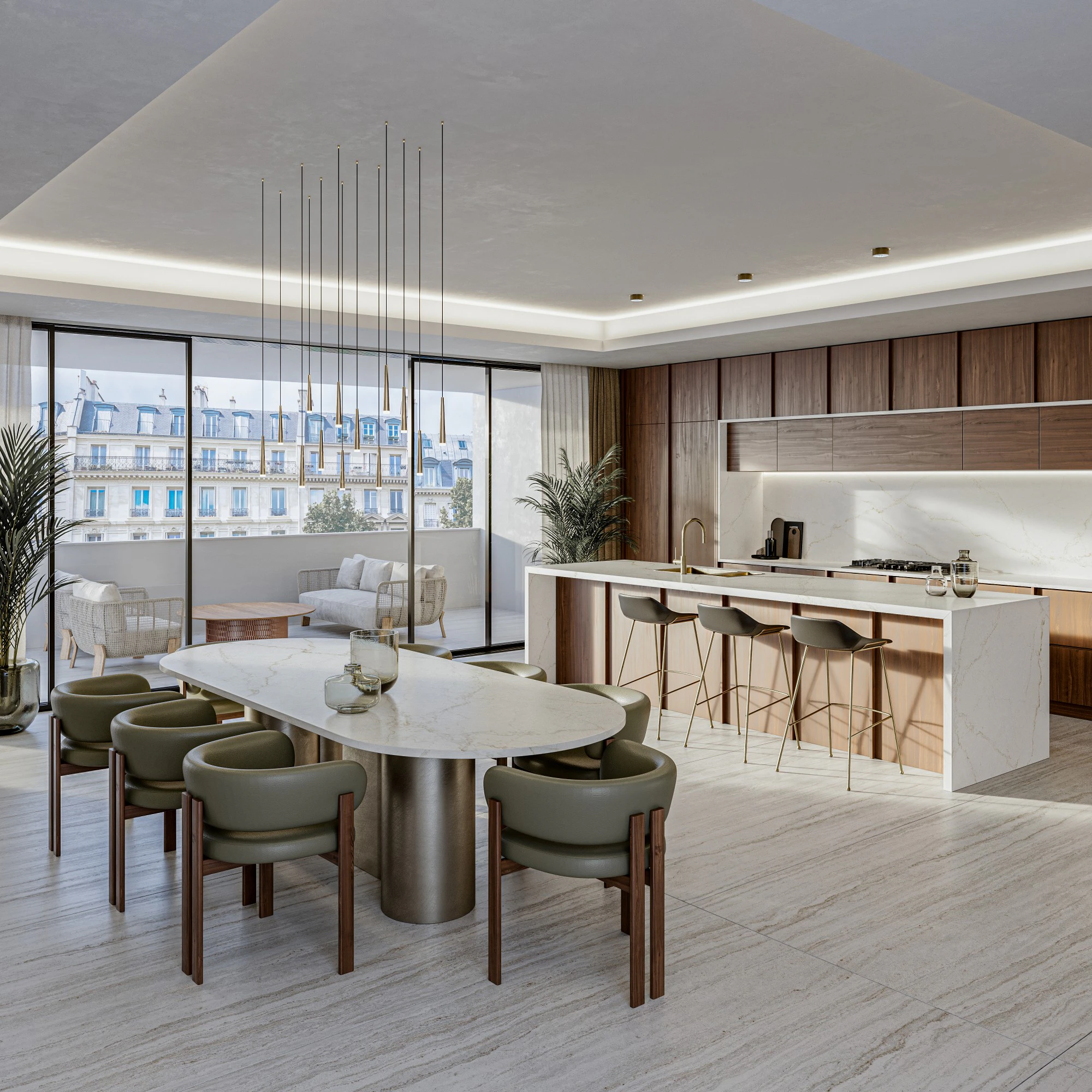 Blanc Élysée: un delicado entramado de vetas doradas, grises y cobrizas, junto con una profundidad gráfica, recorren un fondo crema brillante que actualiza la elegancia atemporal de los palacios clásicos parisinos.