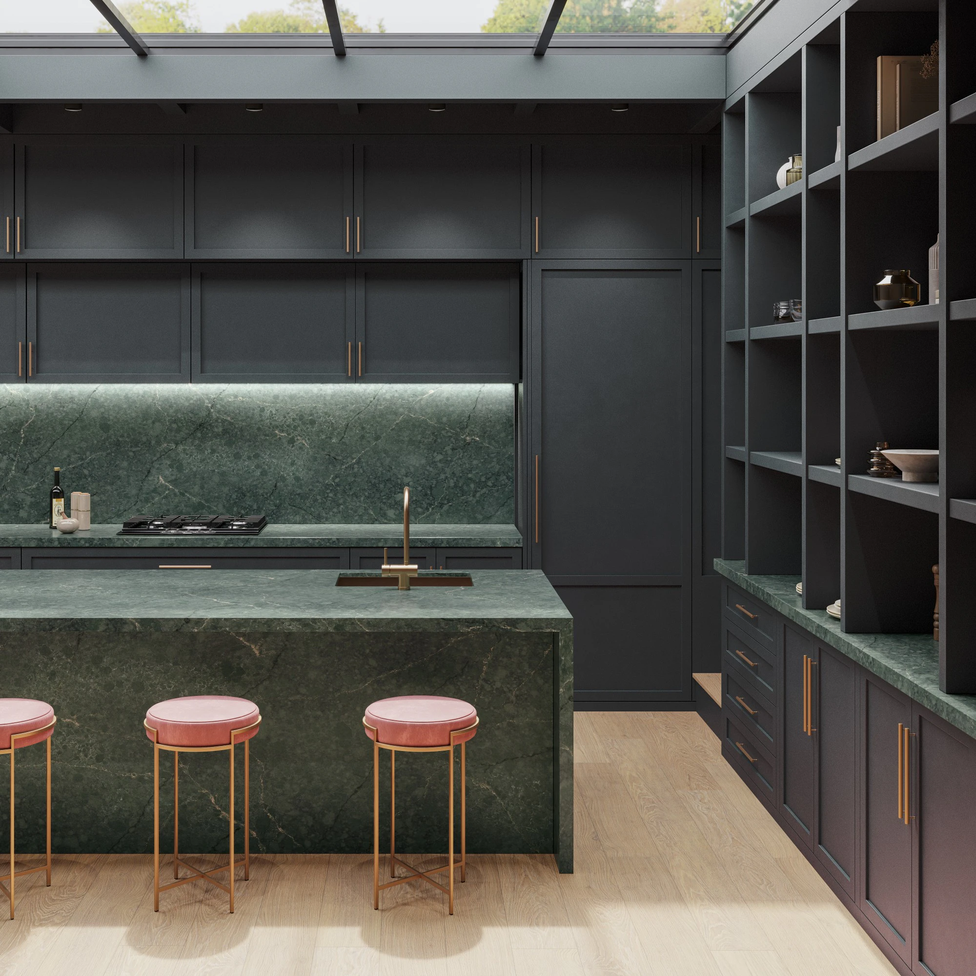 Jardin Emerald: gracias a un sofisticado patrón de vetas doradas con acentos metálicos y notas de color negro y crema, Jardin Emerald reinventa la belleza natural de los mármoles verdes más exclusivos, creando un acabado versátil de gran profundidad gráfica.