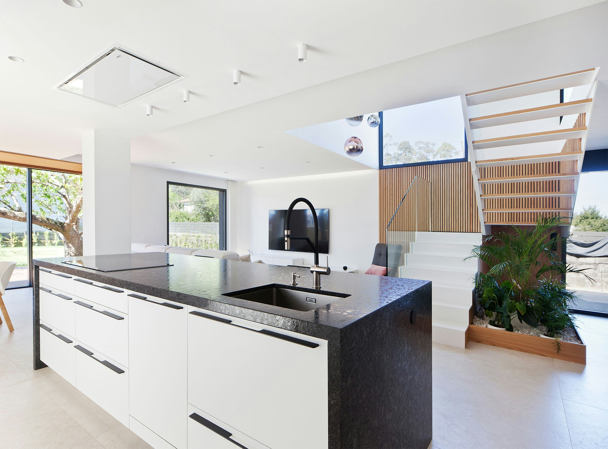 La cocina, en esta nueva vida, es un espacio luminoso, abierto y conectado con el exterior, acabado en blanco y madera. Con esa cantidad de espacio nuevo adquirido, los propietarios del estudio se podían permitir una licencia cromática, de ahí que, entre tanto color claro, la encimera de la cocina, resuelta a modo de isla, se presentó en ese elegante gris que caracteriza a Sensa Graphite Grey.