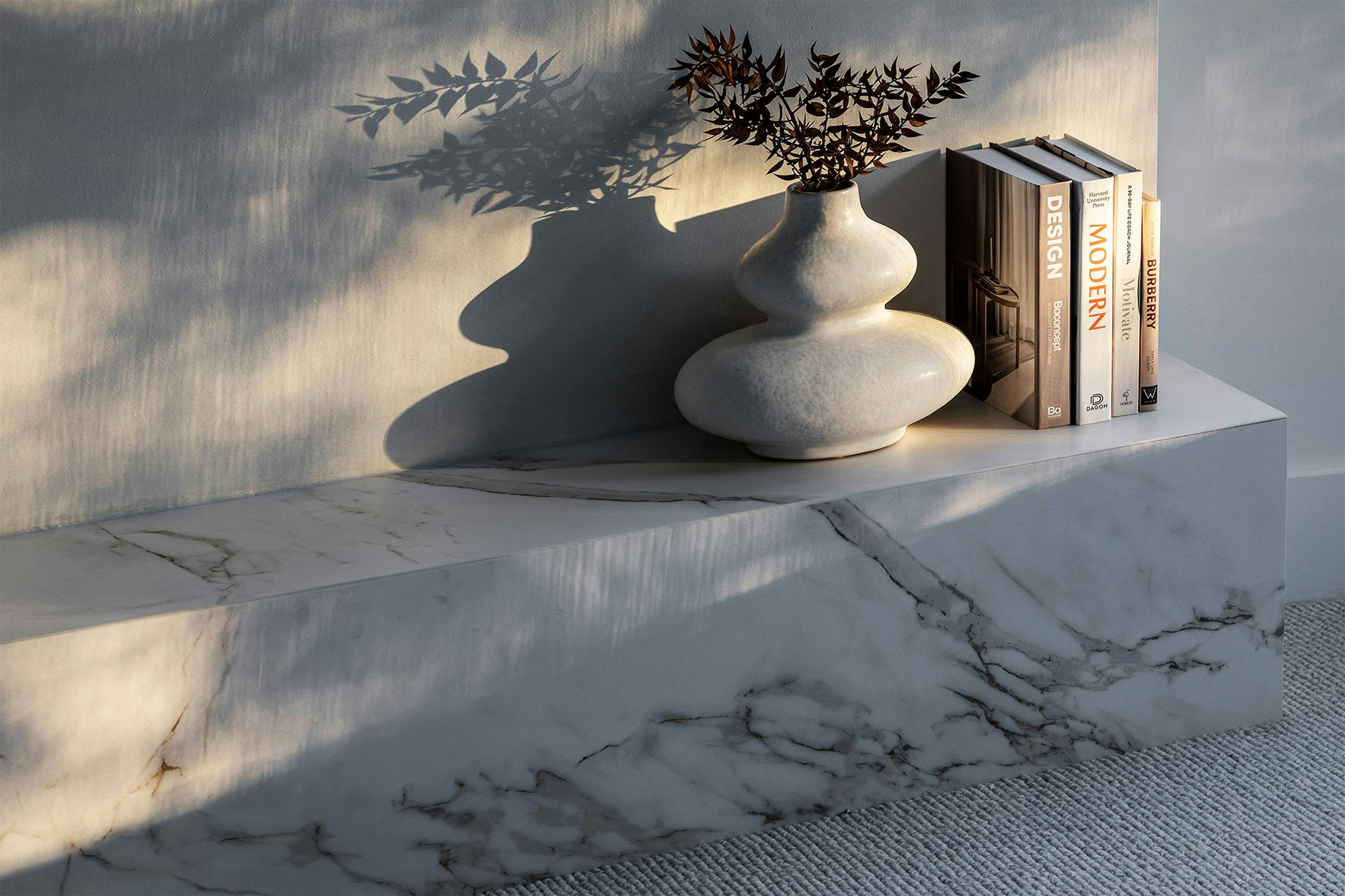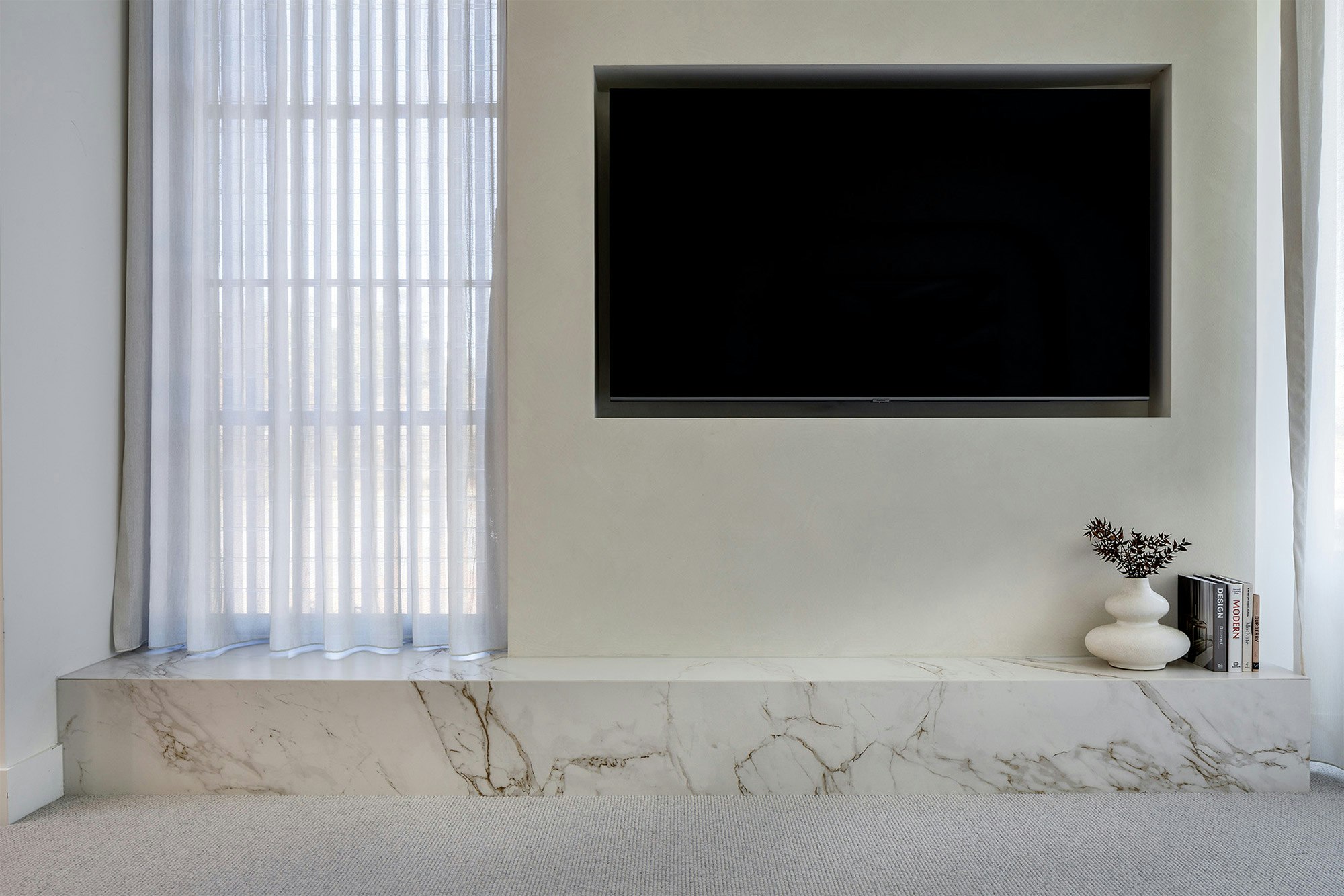 En la cocina, el uso de Dekton Entzo en la isla central es un punto focal. Con un espesor de 12 mm y un elegante detalle de latón en el voladizo, esta superficie es tan impresionante visualmente como extremadamente funcional. El color Dekton Entzo, con su apariencia inspirada en mármol clásico, añade un toque de sofisticación, mientras que el Dekton Kelya de 12 mm, utilizado en las encimeras traseras y el salpicadero, aporta un contraste moderno y audaz.