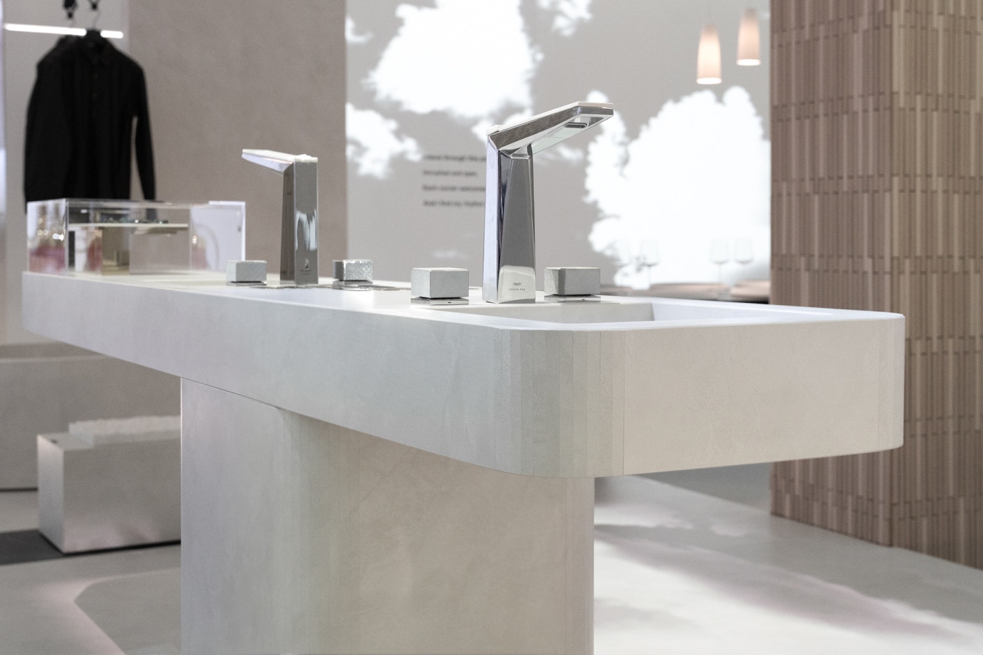 Además de islas de cocina y encimeras, o revestimientos de pared ya presentes en el showroom, destacó la aplicación de los productos de Cosentino en una pequeña instalación basada en una composición de diferentes piezas y cubos que sirvió para presentar la nueva colección de grifería de la marca “VAIA Musselshell and Mother of Pearl”. Para Caroline Schmitt, CEO de Dornbracht “estamos ante una colaboración perfecta ya que ambas firmas buscamos el diseño excelente, una alta calidad y el respeto a lo artesanal. Como demostramos en nuestro showroom, así como en los Cosentino City dónde estamos presentes, aspiramos a crear ambientes inspiradores y emocionales”.