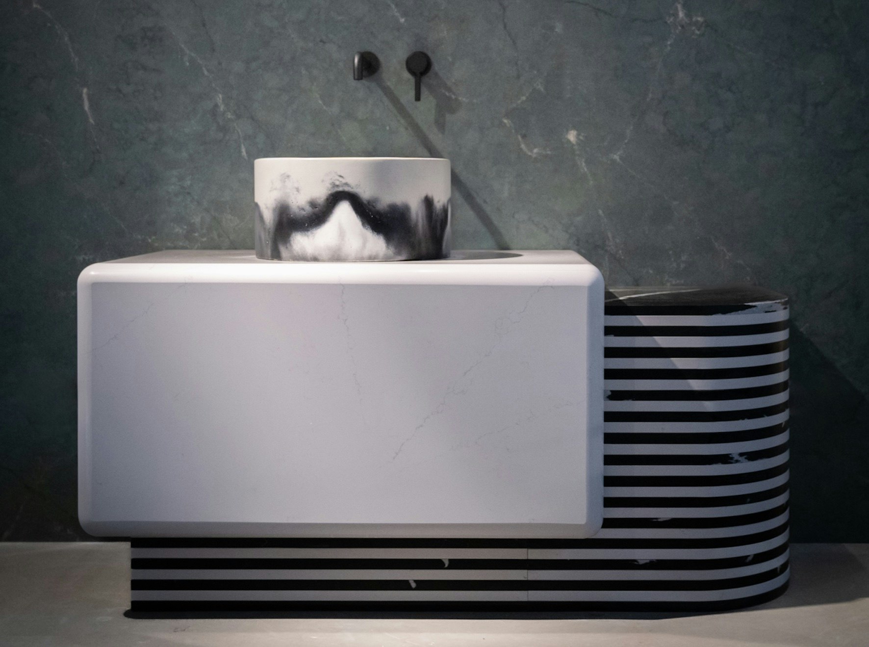 La superficie mineral Silestone® era protagonista de la instalación con tres combinaciones de colores: Jardin Emerald, que acentuó las paredes, mientras que Eternal Statuario y Eternal Marquina se combinaron para crear un tocador y mueble de baño a medida, llamativos por sus detalles de rayas blancas y negras y sus suaves curvas. “La instalación presenta tres piezas principales de autor que crean un efecto visual impactante a través de la fusión del blanco y negro. Ello ha sido posible gracias en gran medida a la versatilidad y las propiedades de Silestone® que lo hacen ideal para diseñar un espacio tan intimo como el baño”, afirmó la diseñadora.