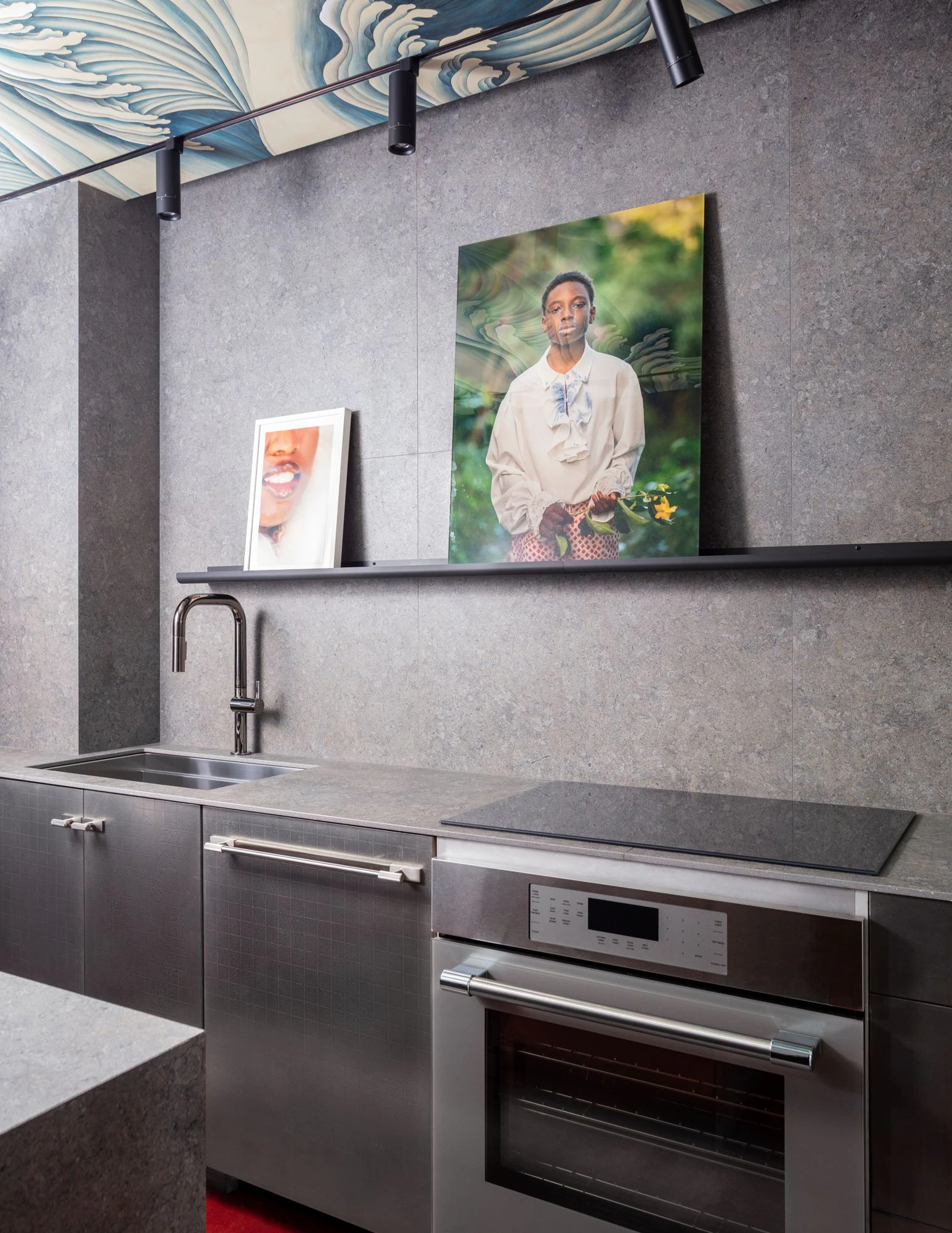 In Salon Analogue, Leyden Lewis Design Studio reimagines the traditional library as a layered, soulful retreat for conversation and creativity. Central to the adjoining kitchenette is Dekton Grafite, which is used on the countertop and backsplash. With its deep tones and subtle movement, Grafite grounds the space with a modern edge while complementing the rich aubergine walls, gold ceiling treatments, and curated art and furnishings collections.