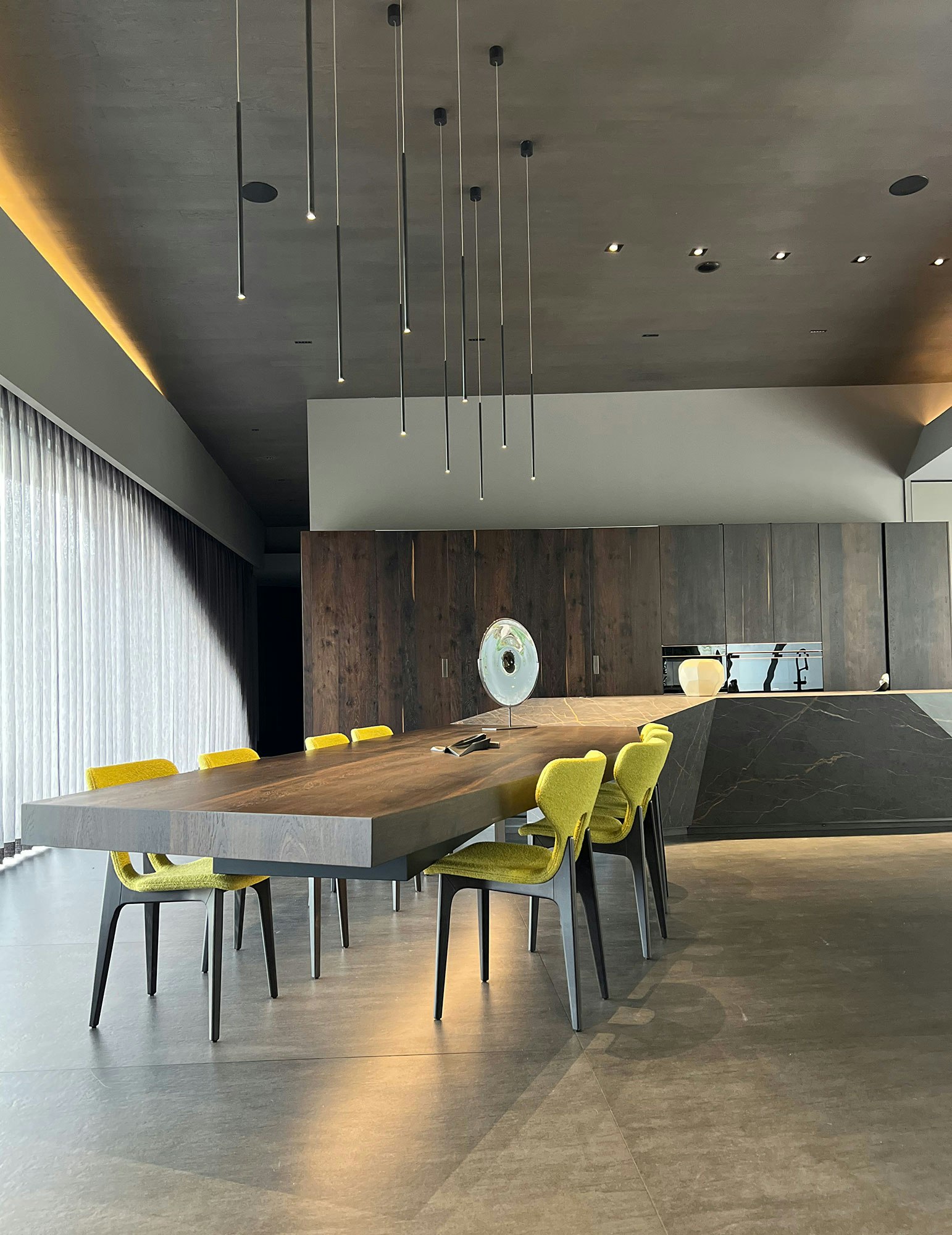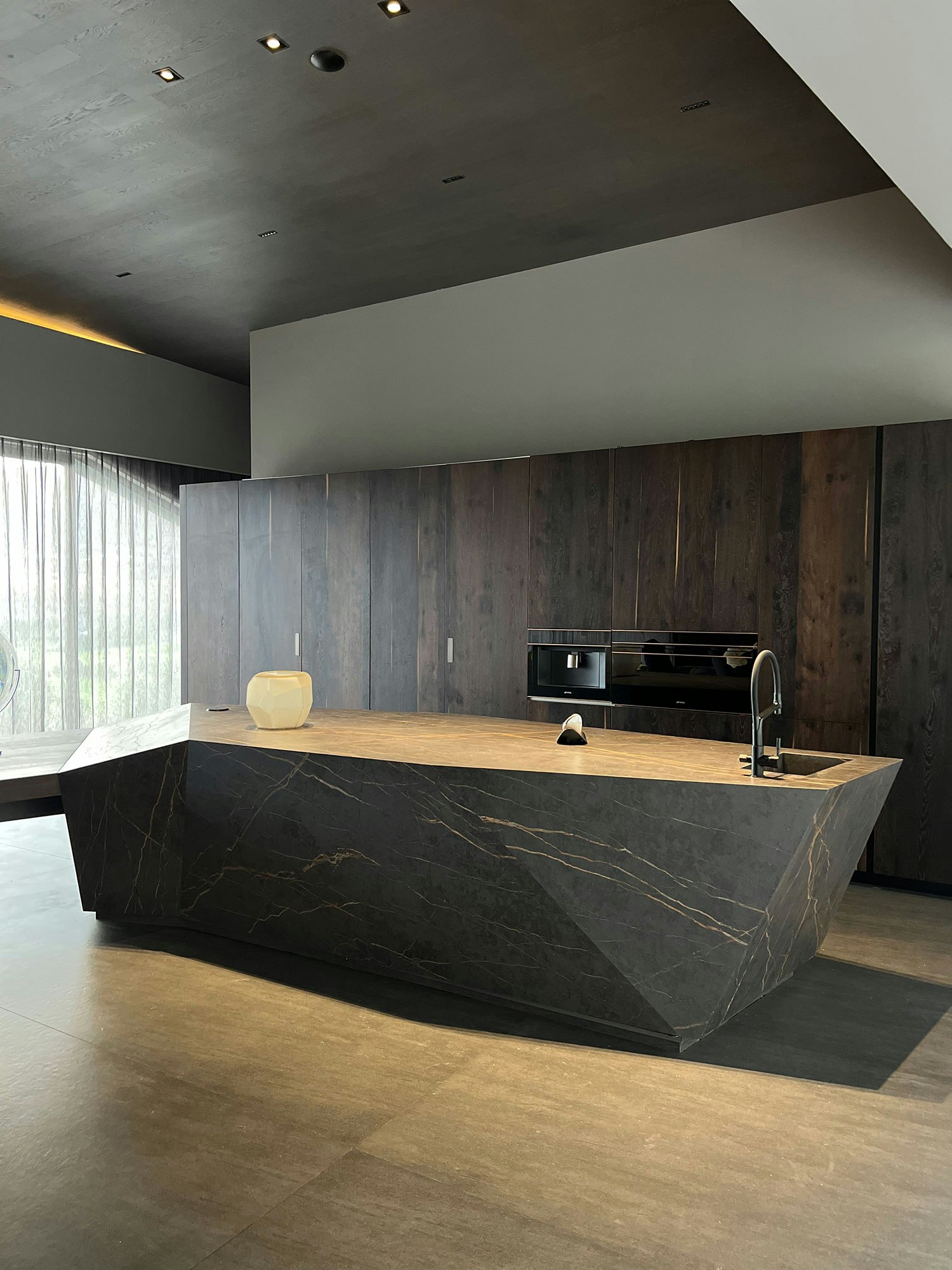 The impressive kitchen island doubles as a genuine sculpture that replicates the vortexes and geometry of the house’s architecture. For a touch of elegance and sophistication, it has been clad with Dekton Laurent, whose sleek gold veins on a dark background add warmth to the space.