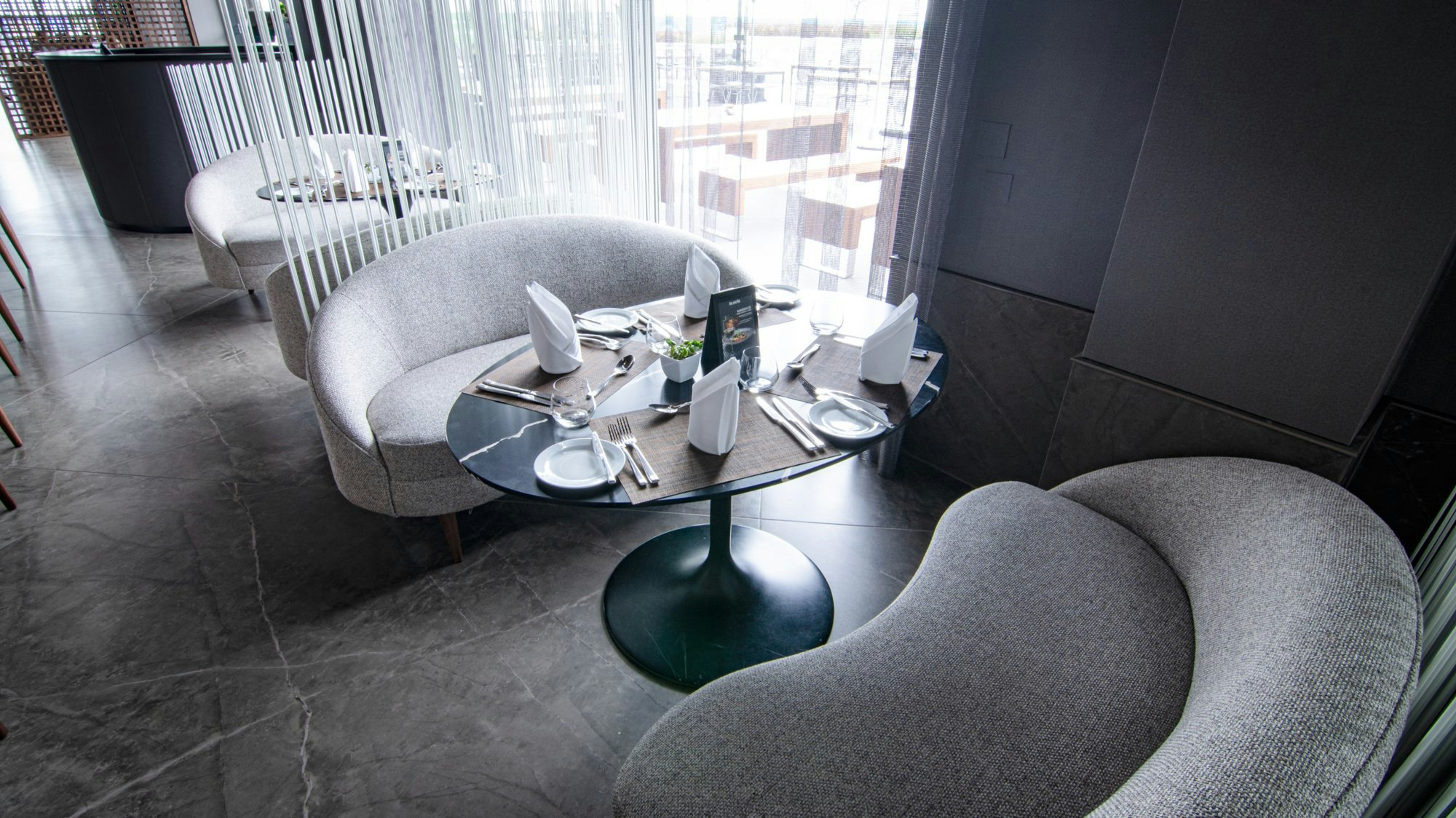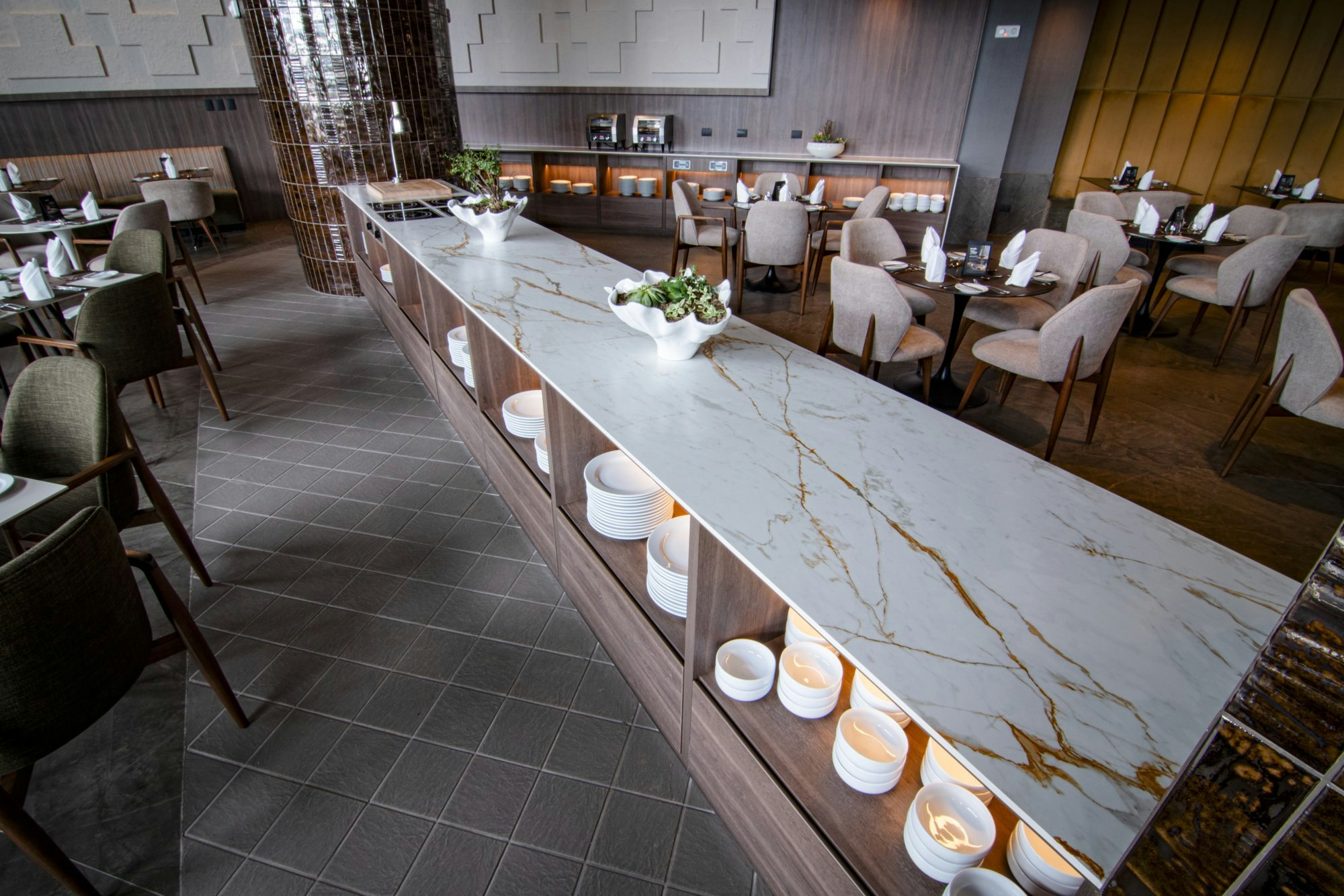The Dekton Kira colour, for instance, with earthy tones contrasting with fine light grey veining, is used on the flooring, creating an environment that is both neutral and refined. The buffet worktop, on the other hand, is clad in Dekton Reverie. This elegant pattern reinterprets the iconic attributes of the precious Paonazzo stone with bold veining in gradients of light greys and creams, combined with oxidised terracottas and soft inked blues.