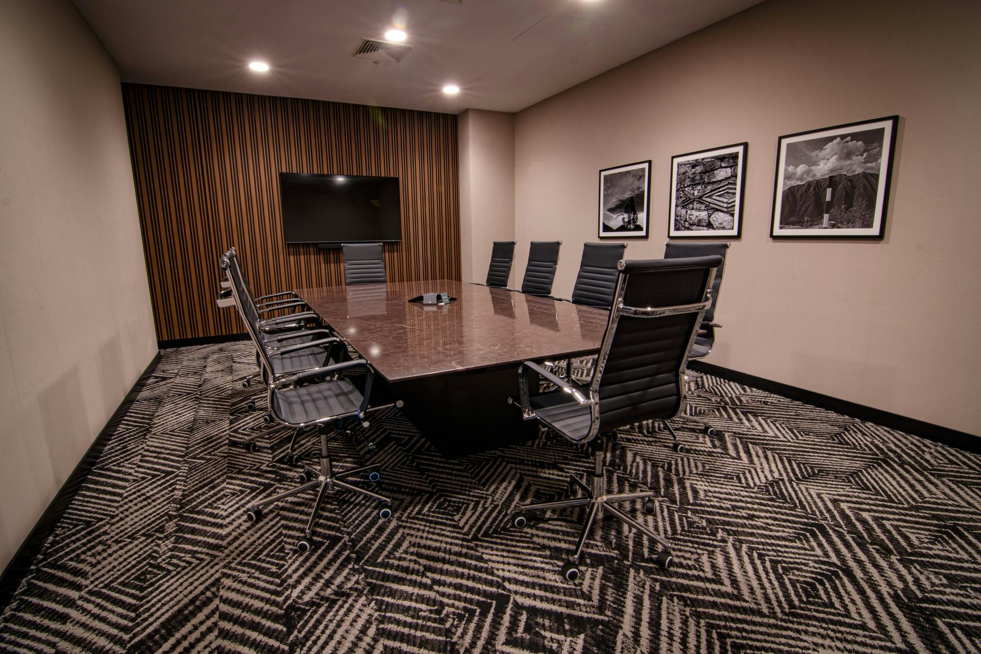 The bathroom worktops, meanwhile, are clad in Dekton Kelya, inspired by dark marbles with light veining, and Dekton Somnia, a deep black with fine and elegant veining. Finally, the boardroom table features a top in Silestone Château Brown.