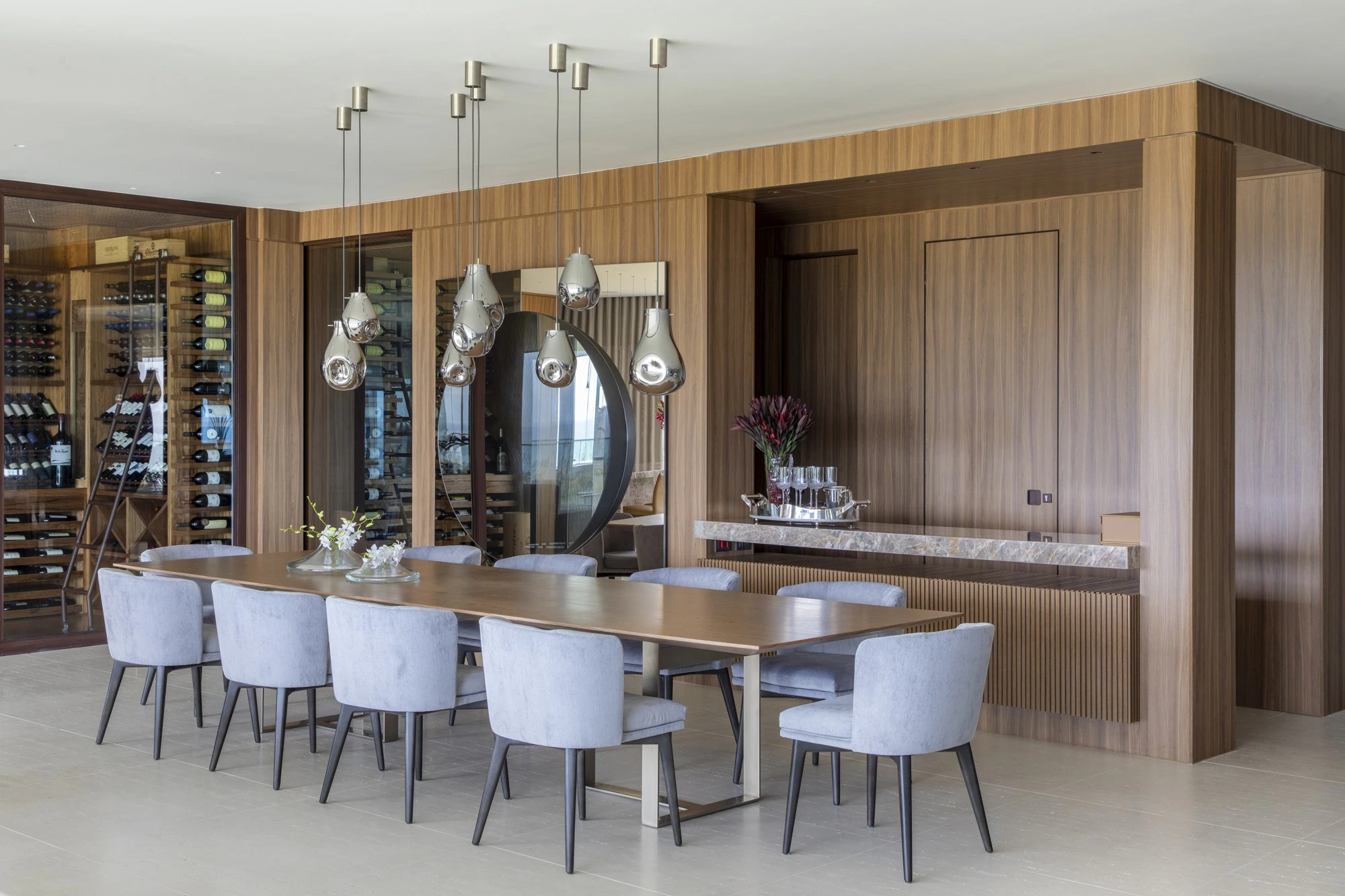 The interior design project began by highlighting the privileged view, which became a central element of the architectural proposal. To enhance this connection with the surroundings, the architect integrated the balcony into the living room and organised the social area into different zones: living room, dining room, TV room, lounge, and gourmet space, creating a continuous and balanced flow. One of the standout features of the layout is the spacious climate-controlled wine cellar, designed not only as a functional area but also as a space for socialising and contemplation.