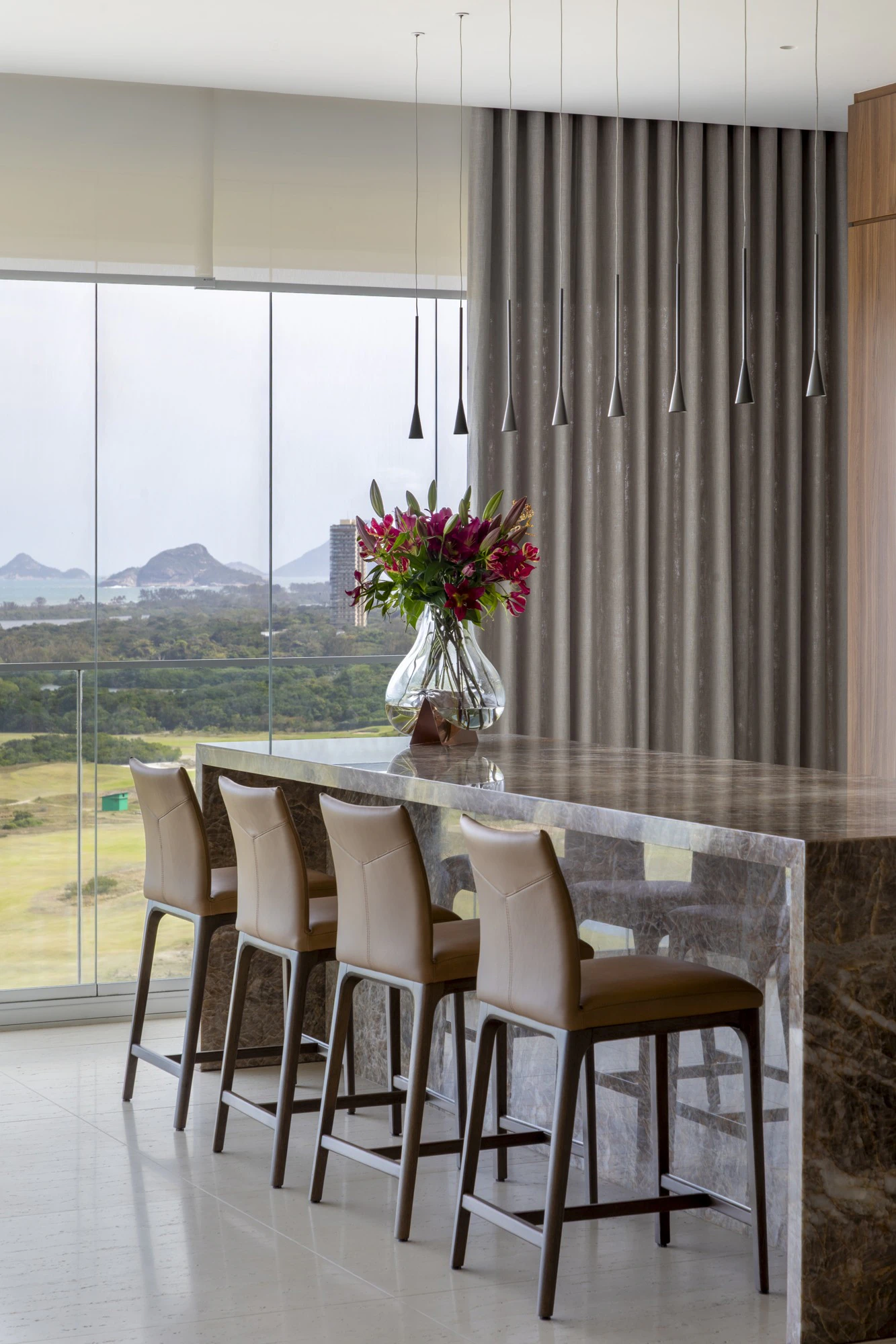 Located in Barra da Tijuca, Rio de Janeiro, this 640 m2 apartment was completely renovated, designed by architect Cristina Côrtes, and became the new home of a couple with three children. With a linear layout, five suites, panoramic views of the sea, the Olympic golf course, the natural reserve, and the Marapendi lagoon, the project was conceived to combine spaciousness, comfort, and functionality, reflecting a new stage in family life.