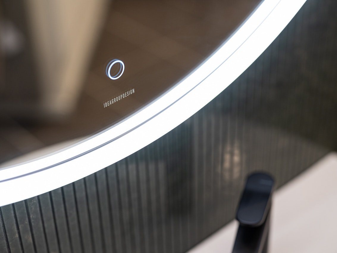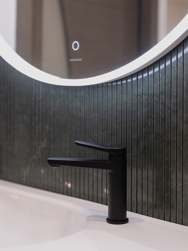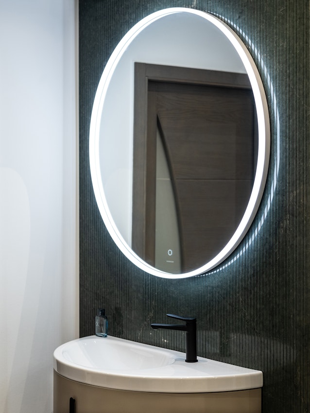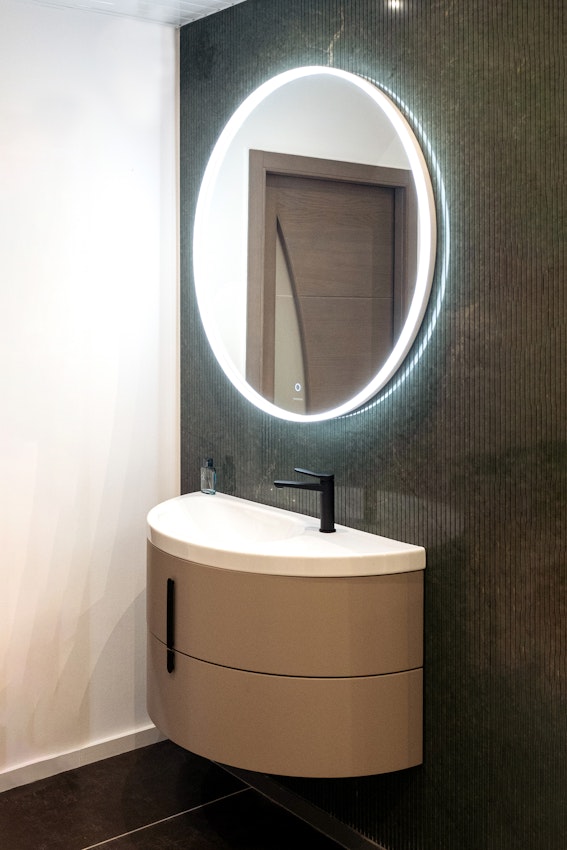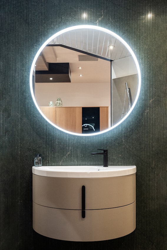 Sur cette réalisation, le panneau UKIYO GV3 est mis en scène en arrière-plan, créant un contraste subtil avec le mobilier aux lignes épurées et le miroir rétroéclairé. Un choix audacieux pour une atmosphère à la fois apaisante et contemporaine.