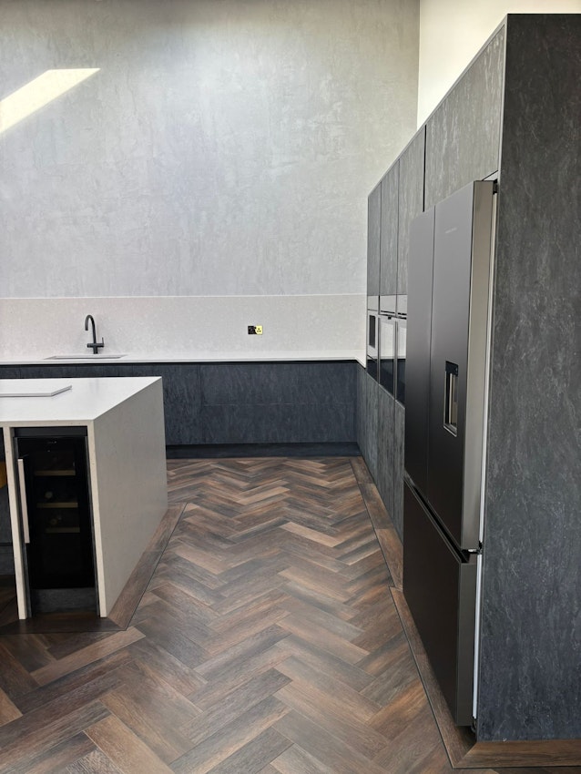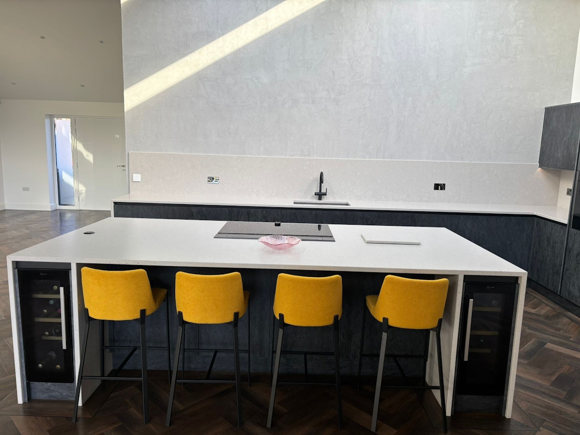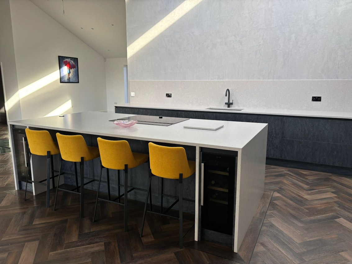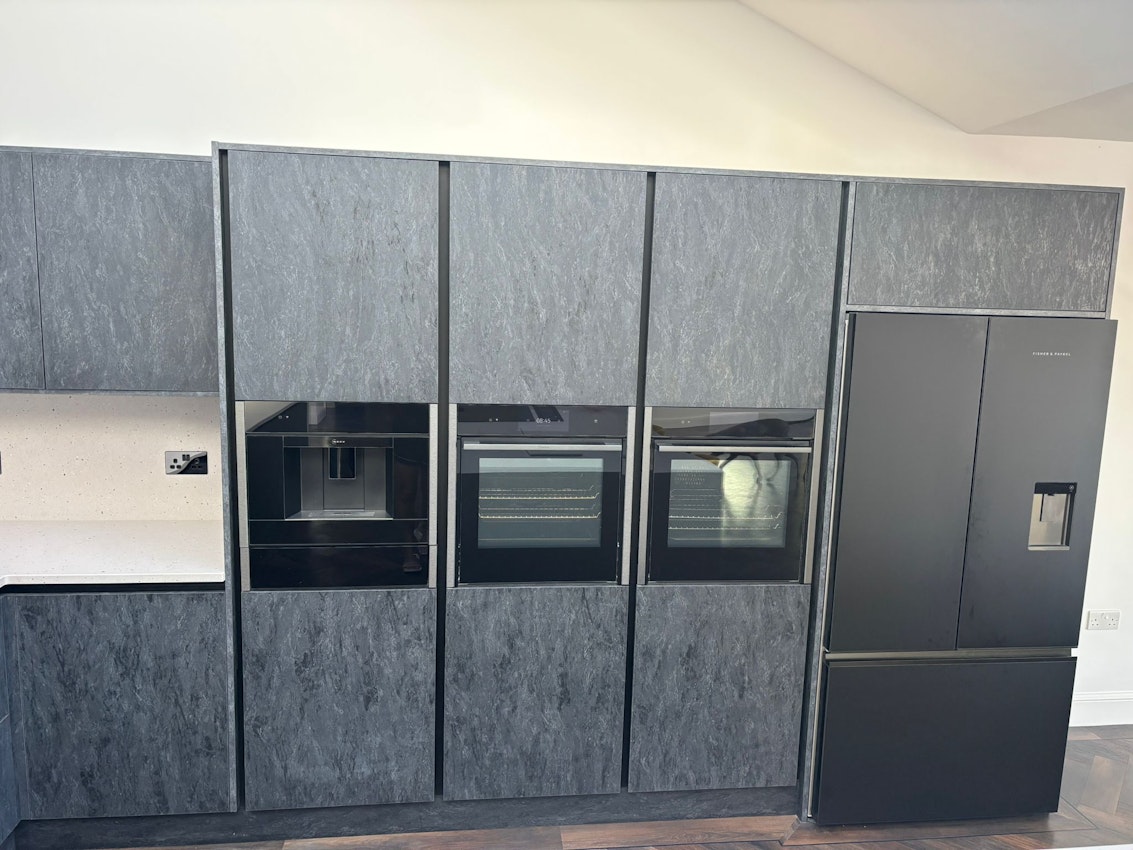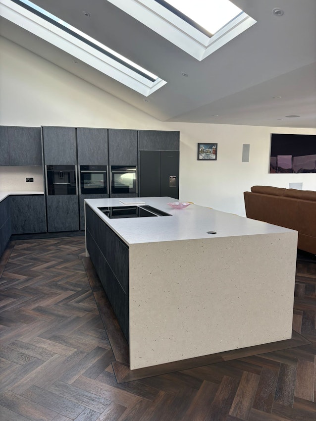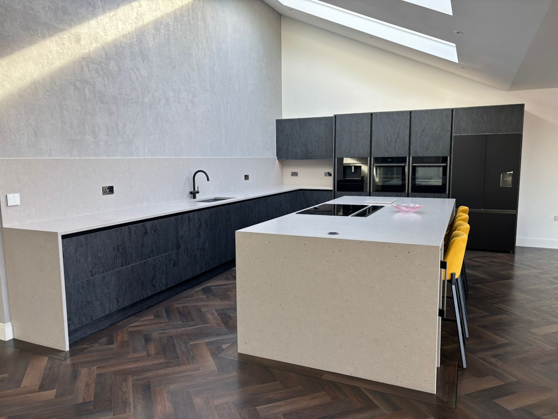 Experience the refined sophistication of our modern true handleless kitchen, designed in the bold Eton Evora Stone Graphite range. Featuring Silestone Concrete Pulse Suede worktops with a sleek splashback across the back wall and matching downstands at the run ends, every detail speaks to contemporary elegance. The space is completed with premium Neff graphite grey appliances for a seamless, cohesive look.