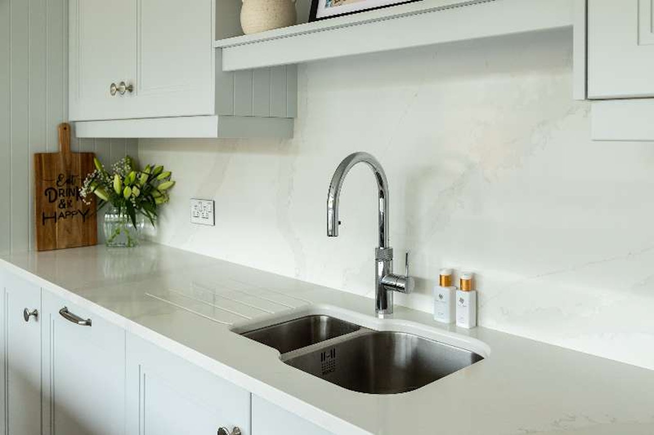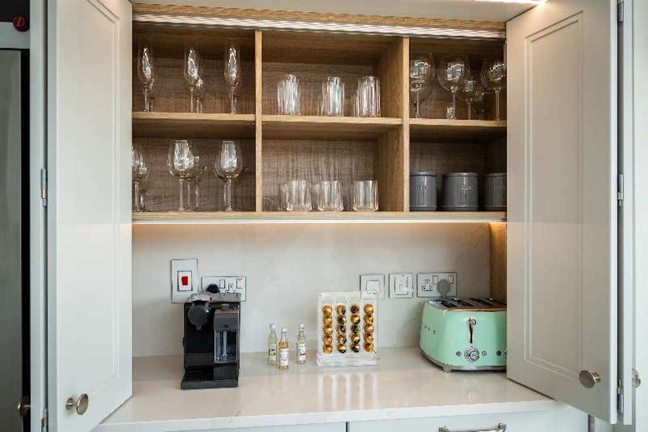 The luxurious Calacatta Gold stone by Cosentino, with its breathtaking gold veining, lends a timeless elegance to the space. This kitchen is truly exceptional in every detail, a harmonious blend of beauty and function from top to bottom.
