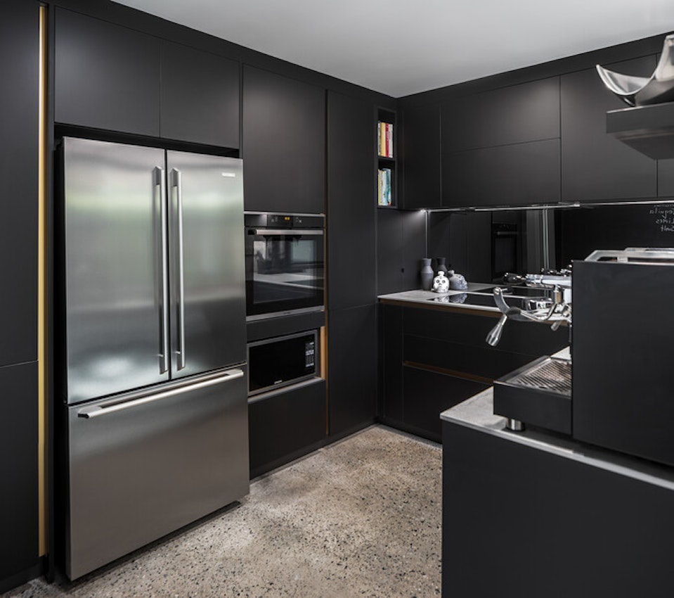 In the new bathroom, we incorporated a space saving laundry behind the folding door cabinetry. Modern black Arredo3 cabinetry with polished concrete floors and black beams gives this home an edgy, modern feel.