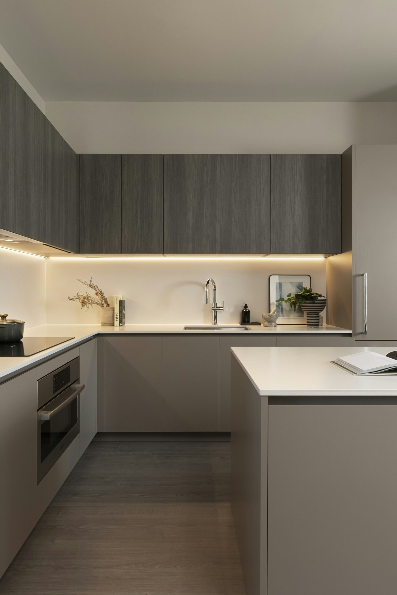 Le concept intérieur repose sur une palette de matériaux chaleureuse et raffinée, équilibrant innovation et élégance intemporelle. Les surfaces de Cosentino jouent un rôle clé dans cette narration. Dans les cuisines et salles de bain, les plans de travails et crédences en Silestone Miami Vena apportent luminosité et sérénité grâce à leurs tons clairs et veinages doux, évoquant le calme de l'environnement naturel au bord de la rivière.