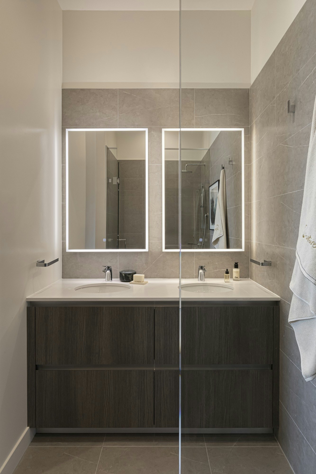 L'idée était de créer une ambiance calme et accueillante, sans renoncer au caractère exclusif. La cuisine, avec ses lignes épurées et ses surfaces en pierre, devient un espace de convivialité qui dépasse le fonctionnel. Les salles de bain, où le dialogue entre pierre et bois se répète, transmettent une sensation de refuge intime et intemporel. L'espace de vie, ouvert à la lumière naturelle et aux vues sur la rivière, intègre l'esthétique des matériaux pour se fondre dans le paysage extérieur.