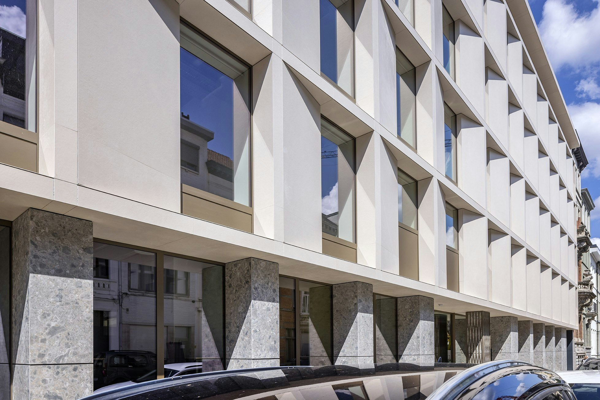Dans le cas de cette façade ventilée, la fixation des panneaux a été réalisée par un système d'adhésif chimique avec un support en agrafe sur la partie inférieure des pièces, permettant de réaliser des découpes de grand format, s'adaptant à la géométrie du bâtiment et aux retours des zones vitrées.