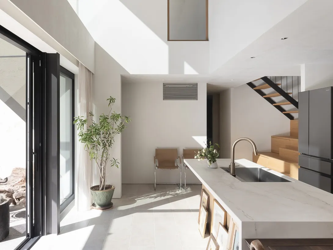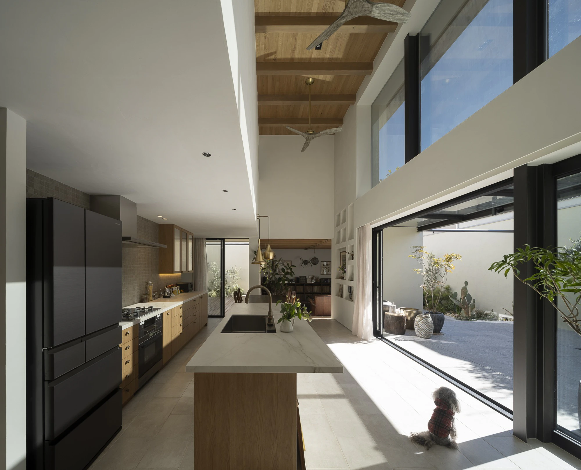 The kitchen layout directly reflects this idea of fragmented circulation and interconnected spaces. Thus, the island serves as a visual and functional axis, aligned with the side openings that connect to the interior gardens, ensuring that daily activities are always linked to the influx of natural light and vegetation.