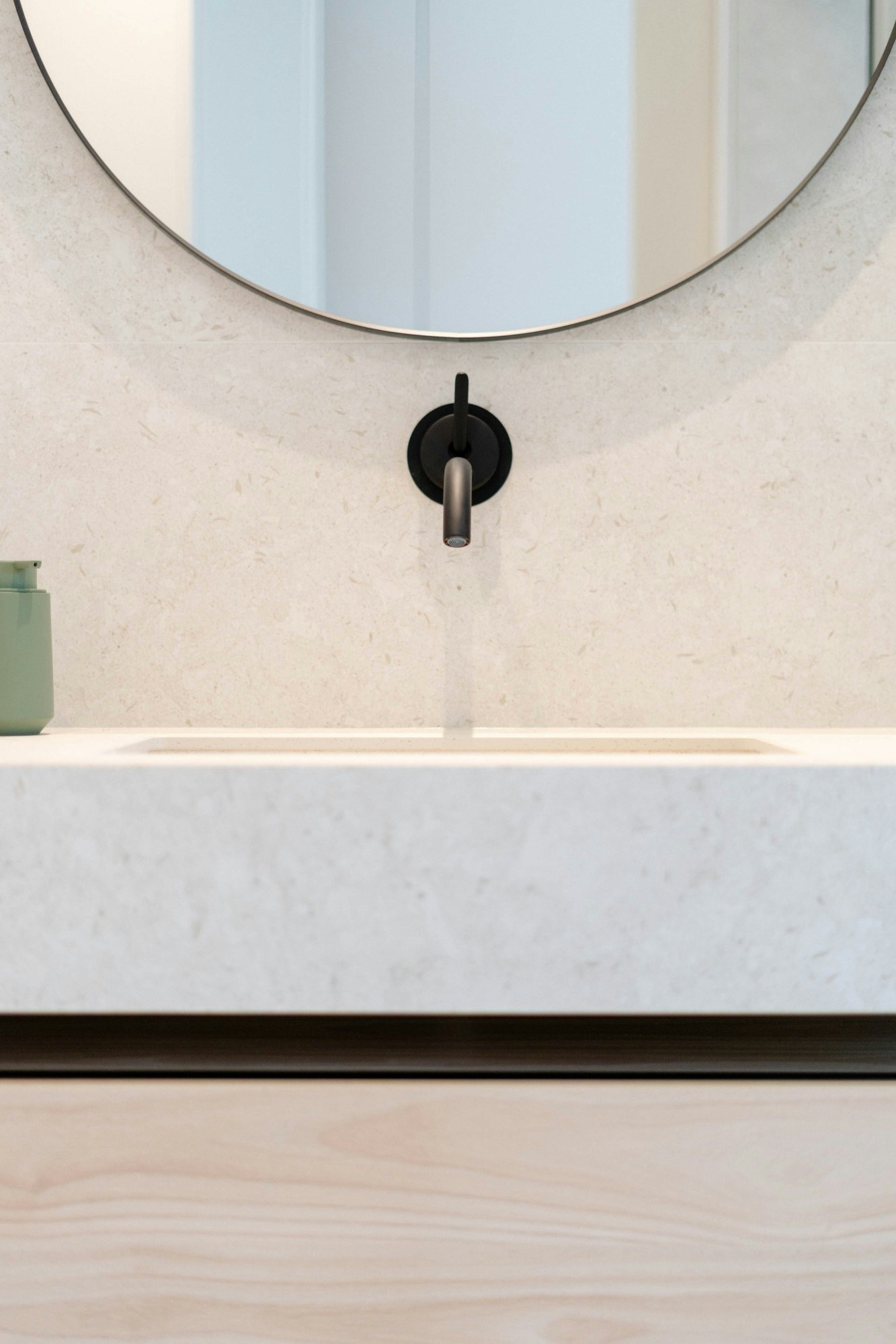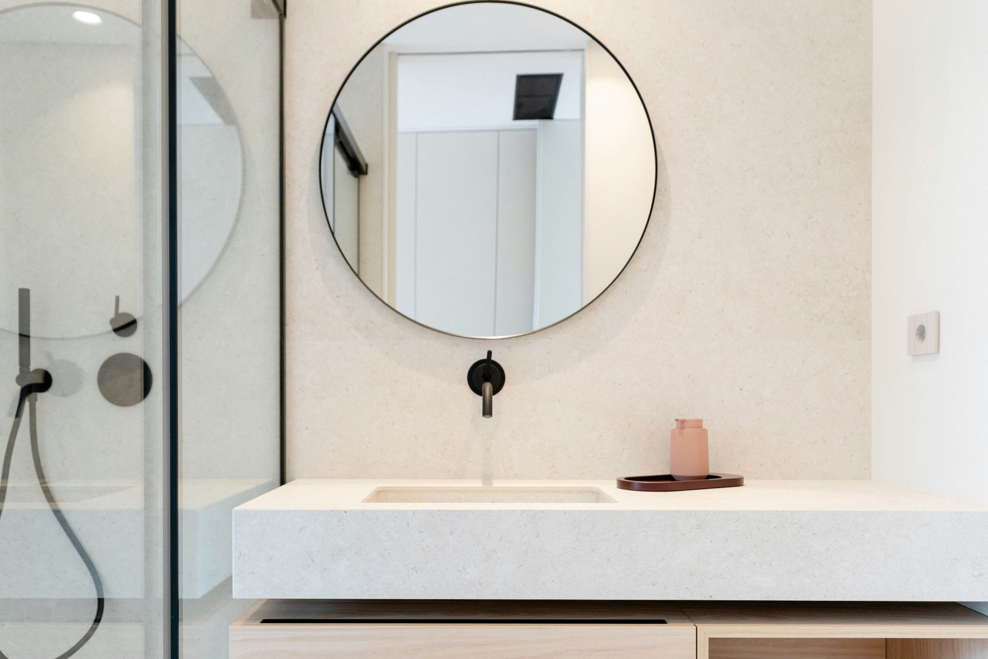 Dekton by Cosentino is present throughout the home, both in the kitchen and bathrooms, consolidating the idea of visual unity and material coherence. The architects explain: “The choice of Dekton as a cladding material in the bathrooms —applied to walls, floors, and integrated washbasins— reinforces the idea of unity and visual continuity, while ensuring resistance, durability, and ease of maintenance.”