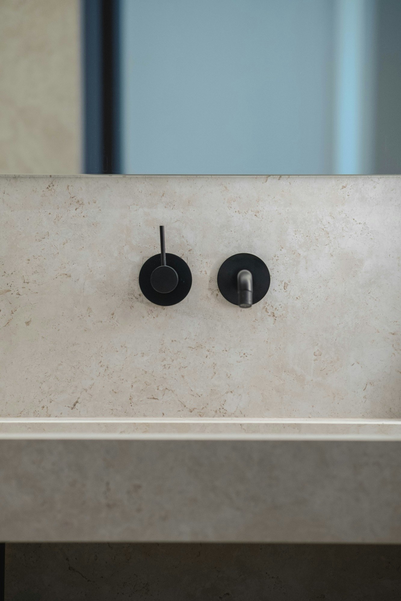 Dans les salles de bains, l’expertise d’Arc Intérieur s’exprime pleinement à travers une pose d’une grande maîtrise technique. Les surfaces en Dekton Sabbia y sont continues, précises, presque sculptées. La vasque, au design angulaire et suspendu, semble flotter dans la pièce, soutenue par un meuble en bois sombre qui prolonge l’écriture de la cuisine. Les raccords sont millimétrés, les joints réduits au strict minimum, et la lumière glisse sur les murs minéraux en révélant toute la finesse du matériau.