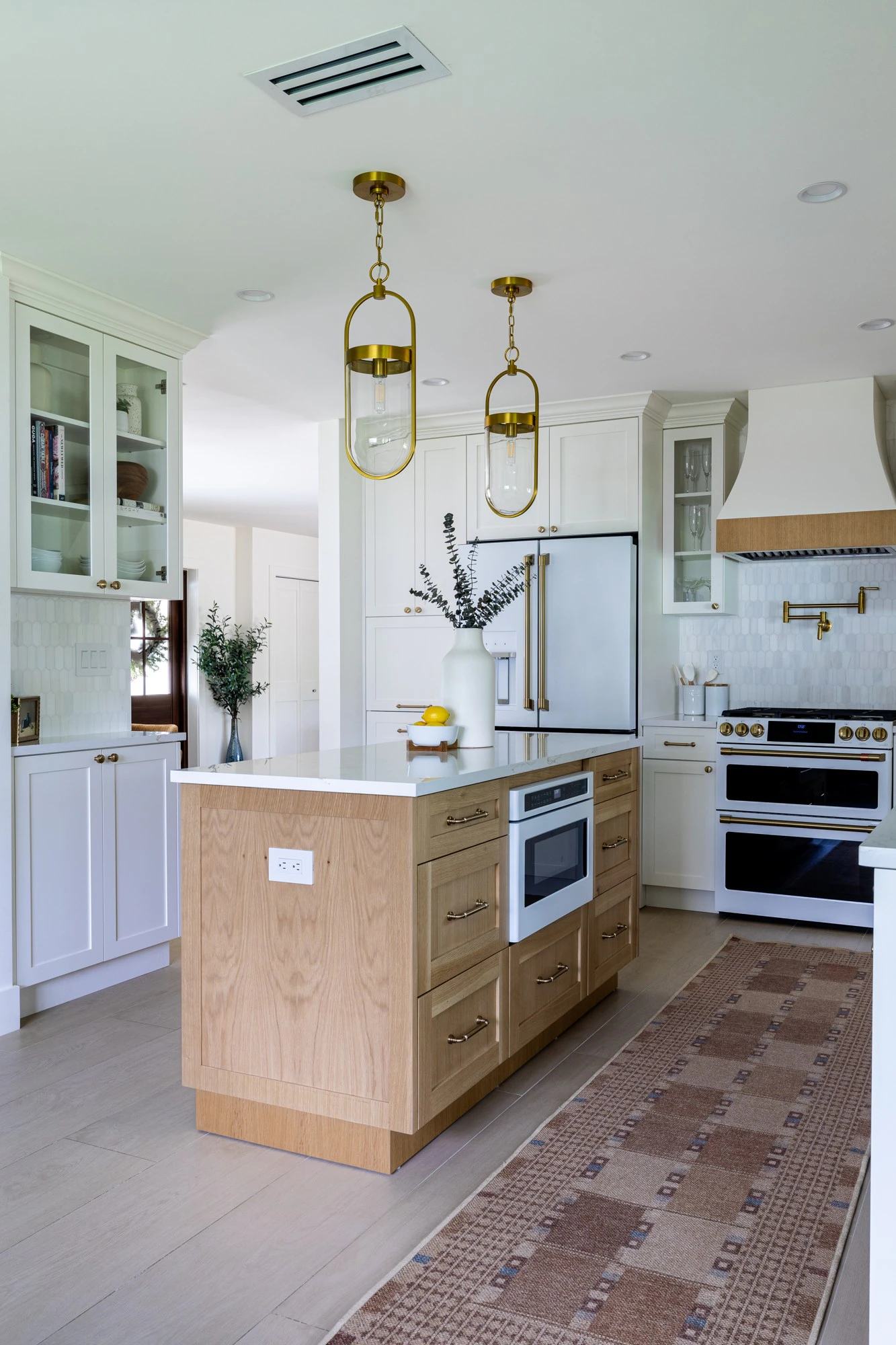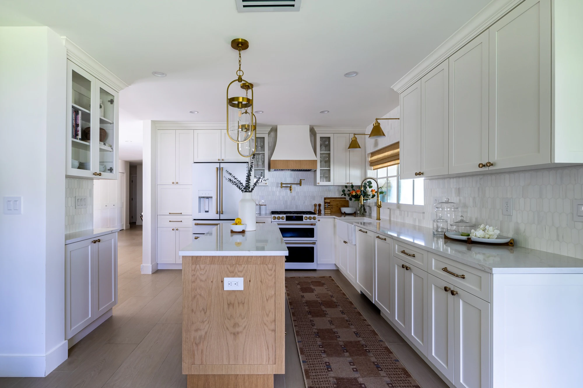 Then, to create the farmhouse look, the designer used a palette of creamy whites and subtle taupes, adding hints of traditional elements and natural materials. Each material was carefully curated to exude a refined and simplistic look - from the Blanc Élysée countertops to the contrasting oak and white cabinets. Additionally, a decorative hood was created to give the kitchen a unique edge that aligned with the desired aesthetic.