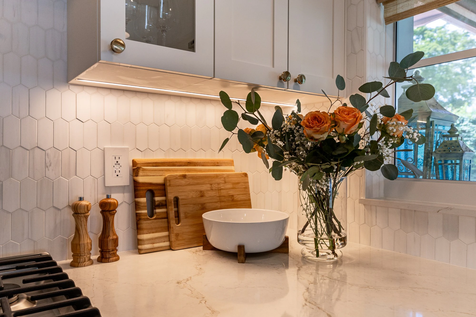 The countertop material had to be just right: a white surface with a touch of veining throughout. Something that was not too plain, but also didn’t distract from the classic simplicity of the design. In comes Silestone Blanc Élysée, a delicate lattice of gold, gray, and copper veins running through a bright cream canvas.