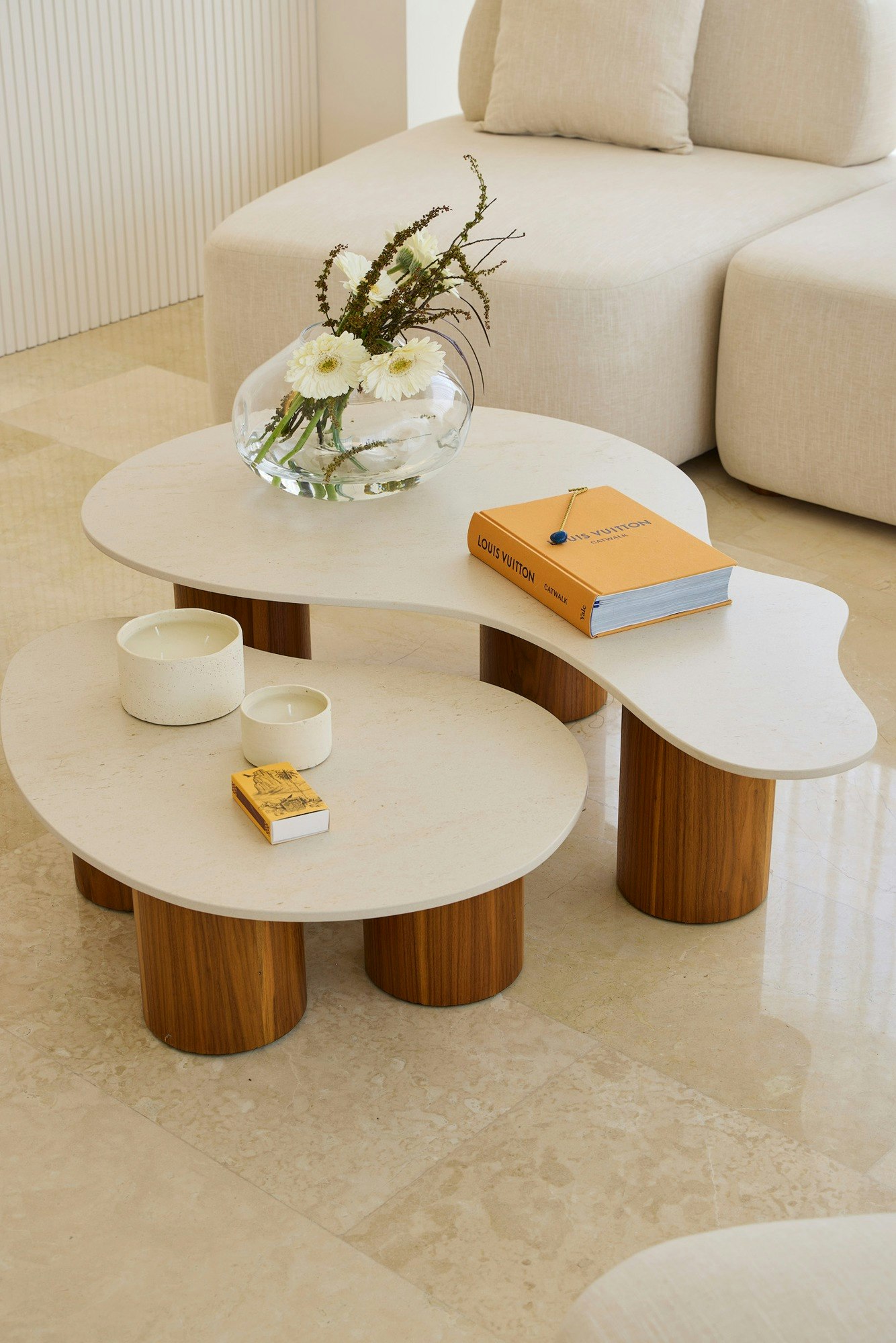 In the living room, the curved-line furniture interacts with the two coffee tables made of Dekton Danae. Its light tone and texture provide visual lightness and contrast with the warmth of the wood, creating a cosy and serene atmosphere. The choice of this material responds to both aesthetic and functional criteria, reinforcing the idea of surfaces designed for everyday use without compromising a “sophisticated” presence.