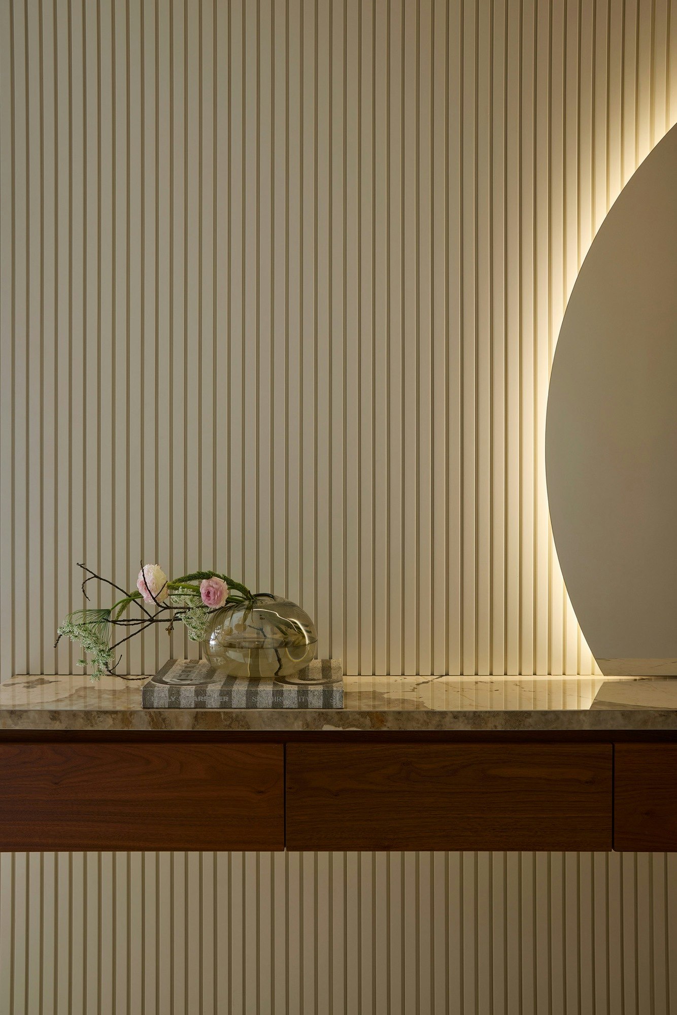 The social area connects the project and concentrates many of its most recognisable features. The entrance hall serves as a prelude, where the presence of Dekton Khalo “adds a touch of elegance” and introduces the material language that unfolds throughout the apartment. It has been used as a cover for the welcoming unit, and its surface competes with the reflection and shine of the backlit round mirror that greets visitors.