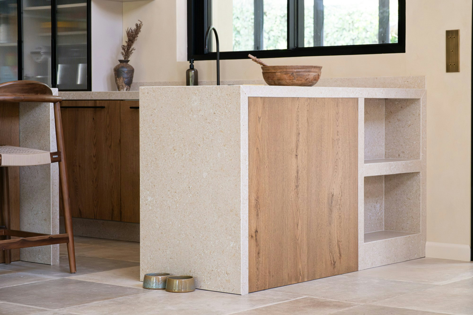 Au cœur de la villa, la cuisine devient une pièce manifeste. L’îlot central, réalisé en Dekton Avorio, déploie son esthétique minérale. Son effet pierre naturelle italienne, aux nuances crème délicates, s’accorde à la chaleur du bois et confère à l’espace une élégance intemporelle. Plus qu’un simple plan de travail, il se transforme en véritable sculpture, centre de gravité de la maison.