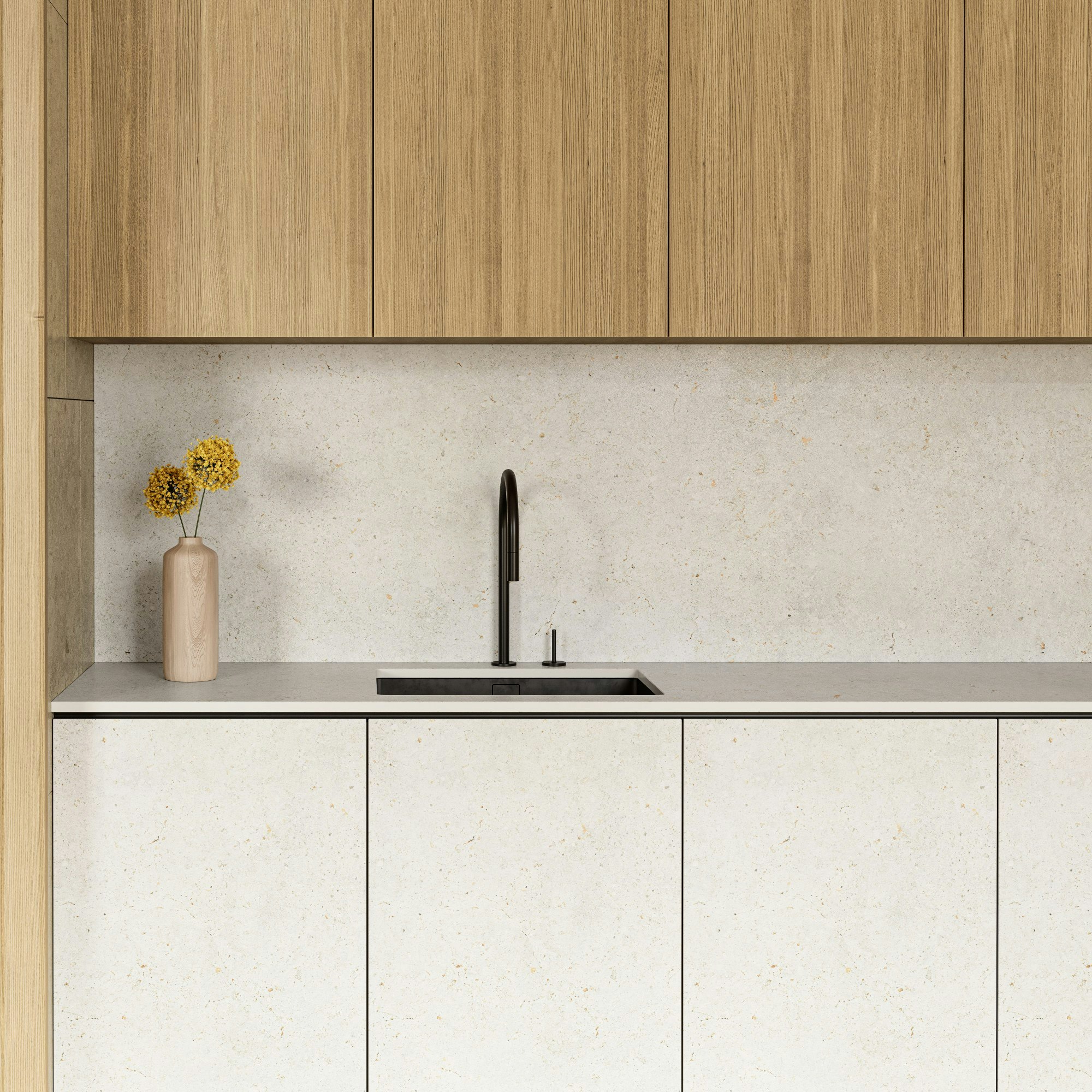 POLAR : une réinterprétation de la richesse visuelle de la pierre Campaspero, et de ses superbes irrégularités, dans un motif unique hyperréaliste qui combine un fond beige irrégulier traversé de veines grises et crème avec des détails subtils et des incrustations fossiles... La beauté de ce calcaire classique, sublimé par la force de Dekton.