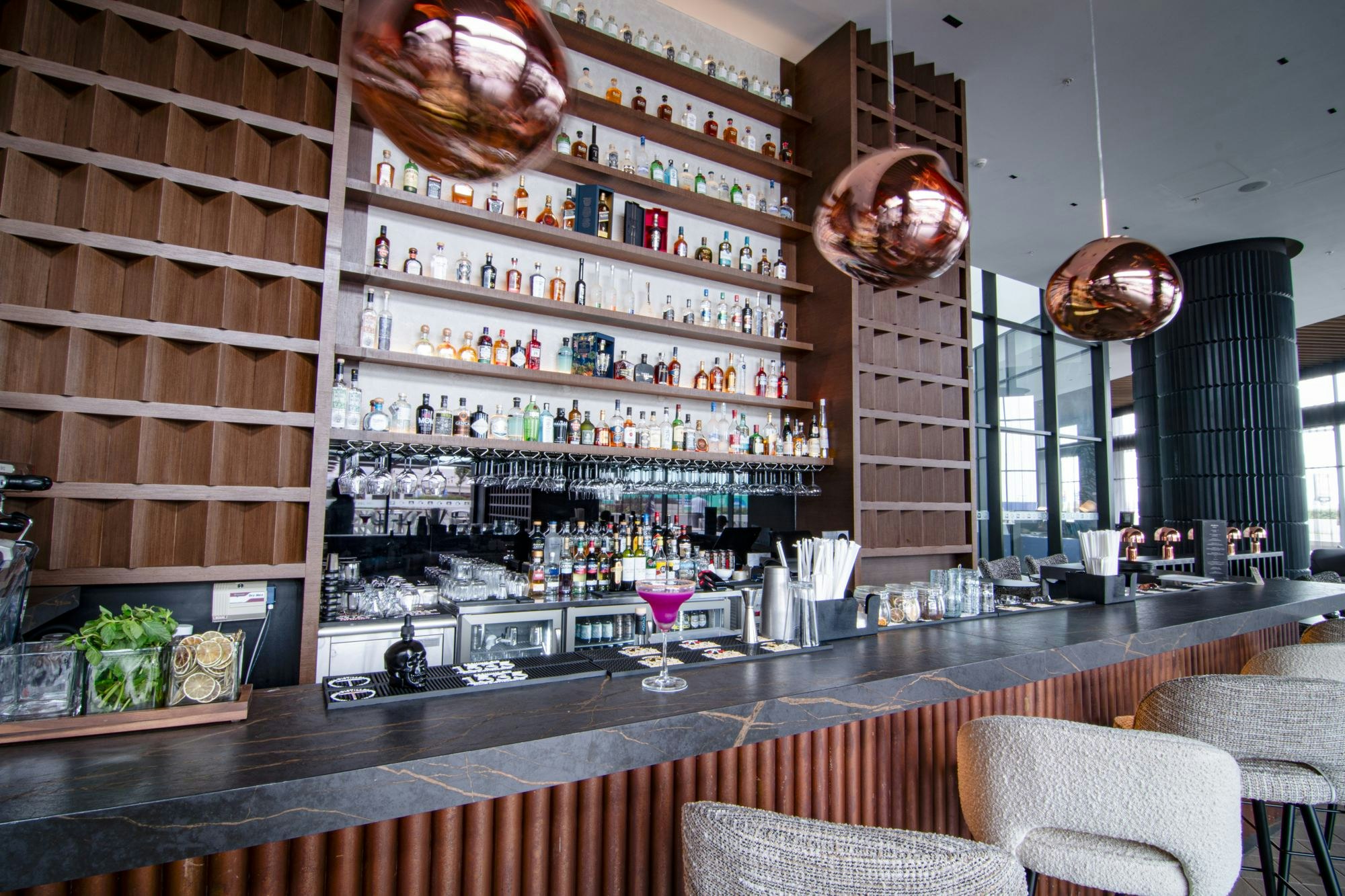 For the bar worktops, the designer chose Dekton Aeris, with a light-toned base and cream details inspired by Piedra Paloma limestone, and Dekton Laurent, a dark colour with golden veining inspired by the natural stone Port Laurent.