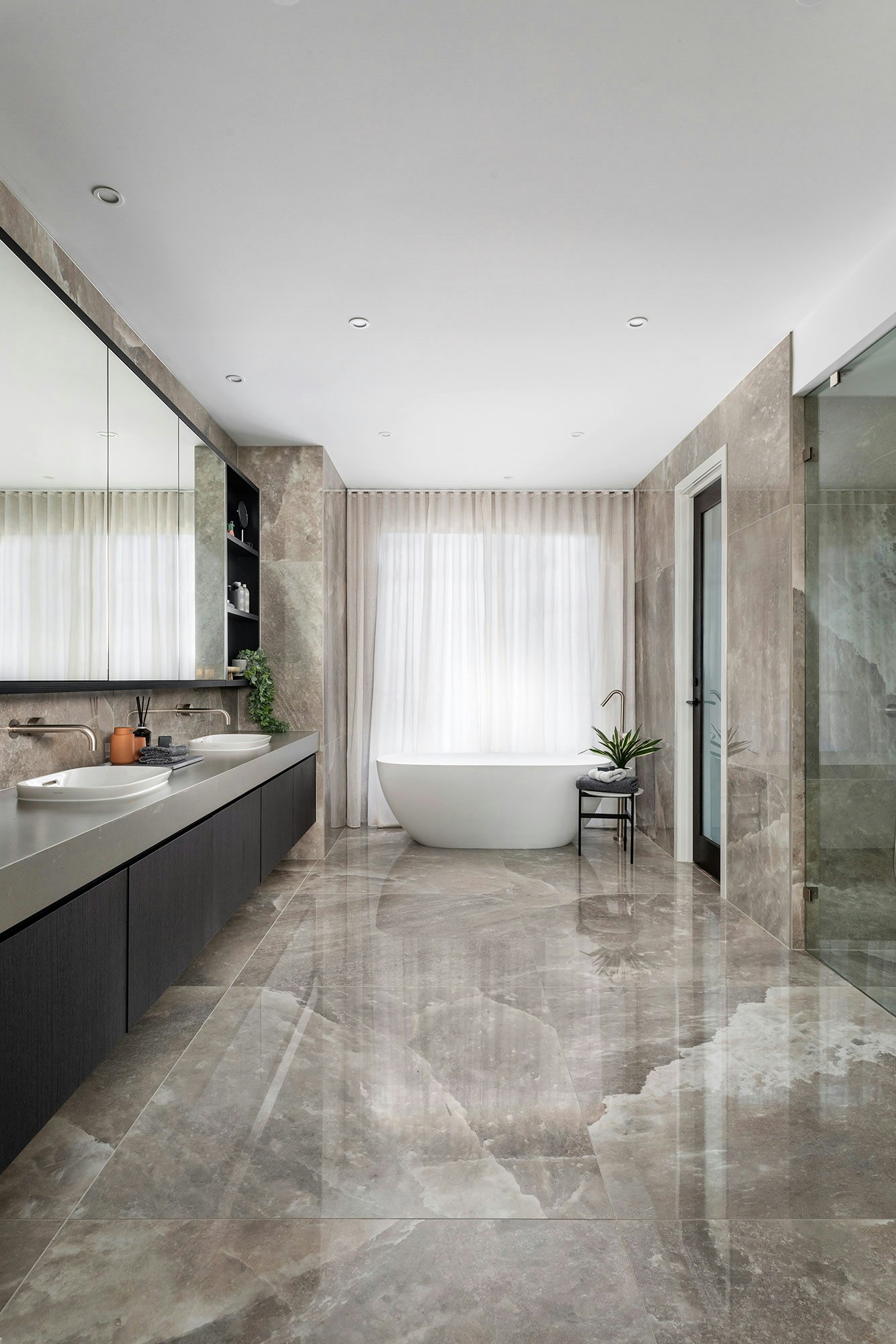 Notre catalogue propose plus de 200 couleurs, avec différentes épaisseurs et finitions qui vous permettront de choisir toutes les applications pour votre salle de bains : sol, crédences, plan de salle de bains, vasque et receveur de douche. De plus, avec nos tranches Dekton Slim de 4 mm, vous pouvez utiliser le revêtement de votre mobilier de salle de bains pour lui donner une finition soignée et un design intégré.