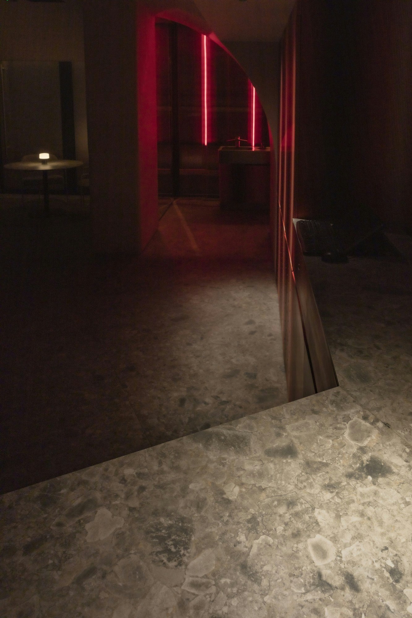 Ceppo, with its composition of grey stones of varying sizes, evokes an almost inhospitable mineral landscape, a direct reference to the region. “The chosen flooring evokes a rough, primal terrain,” the project team notes, reinforcing the connection to Peruvian imagery through a contemporary lens.
