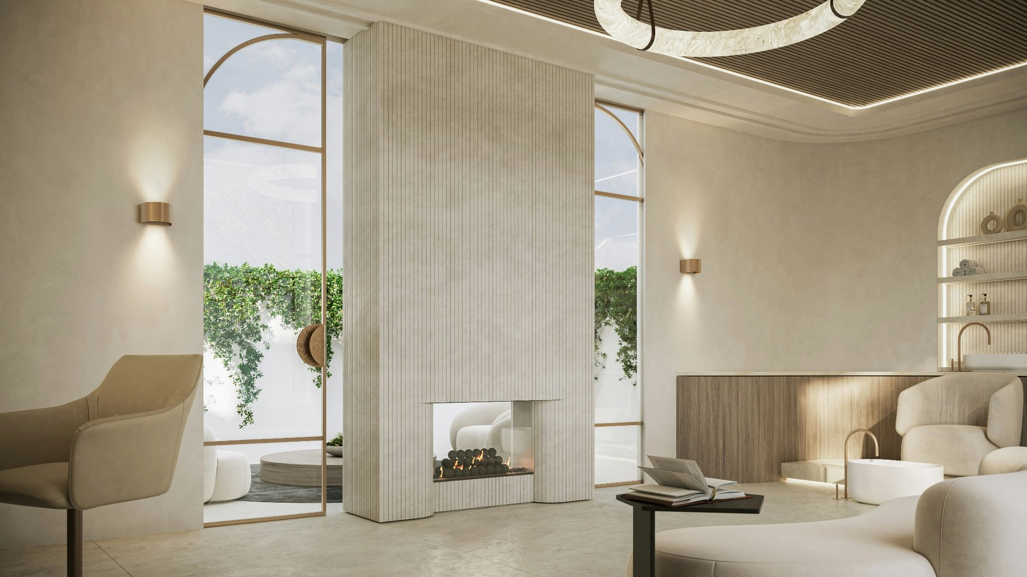 Grâce à son revêtement rainuré du sol au plafond en Dekton Nacre, la cheminée devient l’élément architectural central de cet espace. Cette surface est aussi utilisée sur la façade des étagères encastrées, qui ont été éclairées par des LED.
