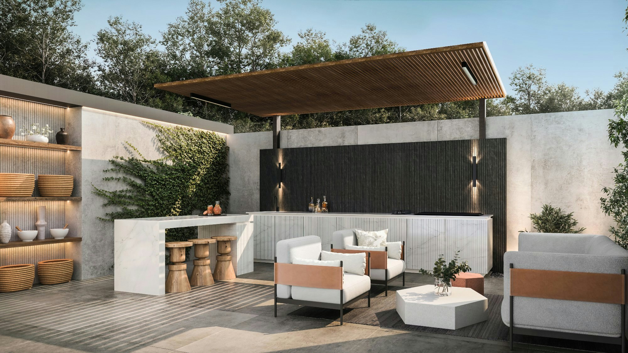 Claudia nous fait découvrir les applications infinies des finitions rainurées avec ses créations de meubles d’extérieur revêtus de Dekton Bromo, comme ces lits balinais assortis au mobilier de cuisine d’extérieur.