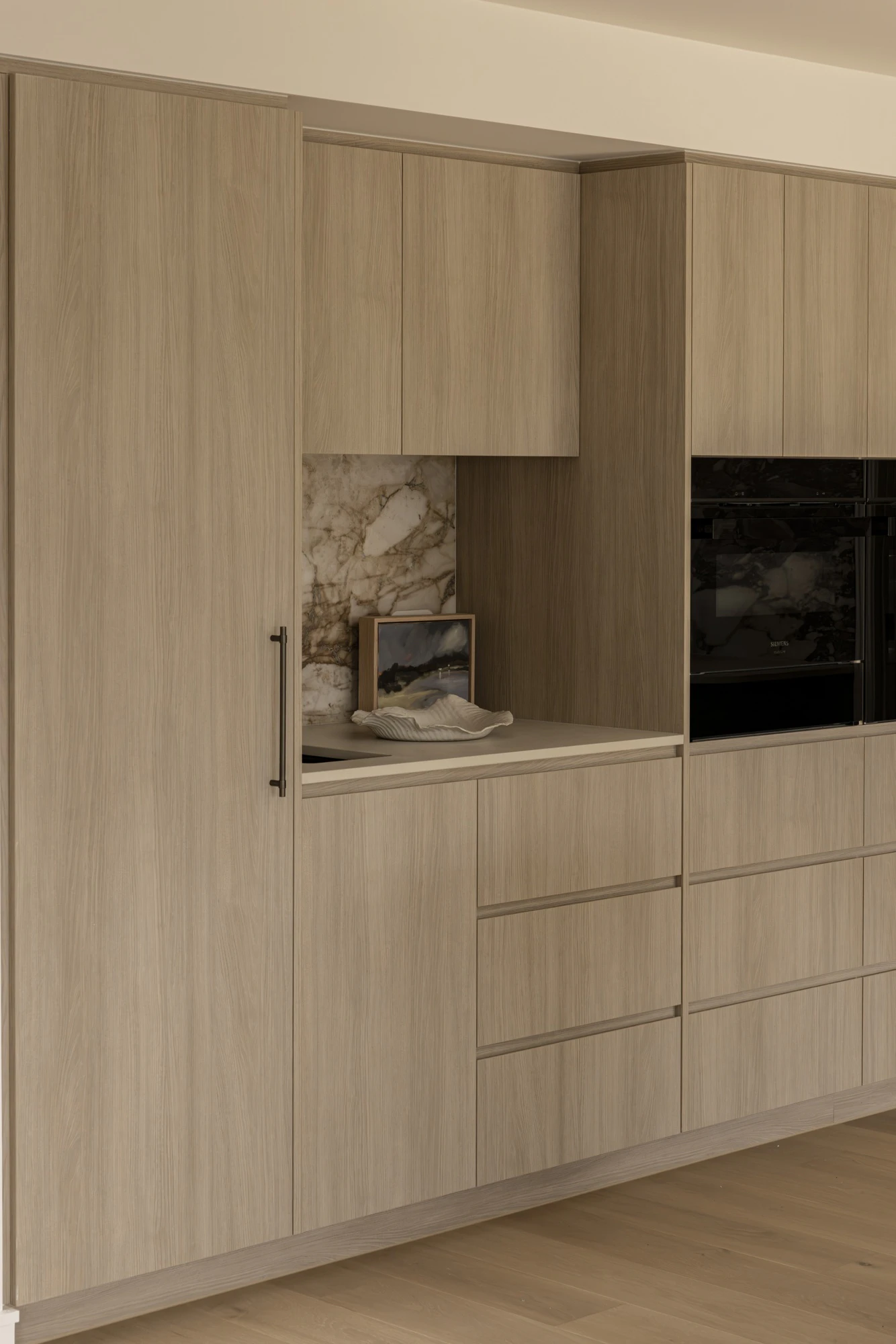 “Dekton Albarium was used in the kitchen, pantry and laundry room to ensure continuity and practicality in high-use areas. Its high resistance to stains, scratches and heat made it an ideal choice for these spaces, especially in a home where the kitchen serves as the central hub,” says Newr. “The material was also chosen for its ability to complement the richness of the Calacatta Viola marble fronts, allowing this natural stone surface to remain the focal point while reinforcing the coherence of the material palette,” they continue.