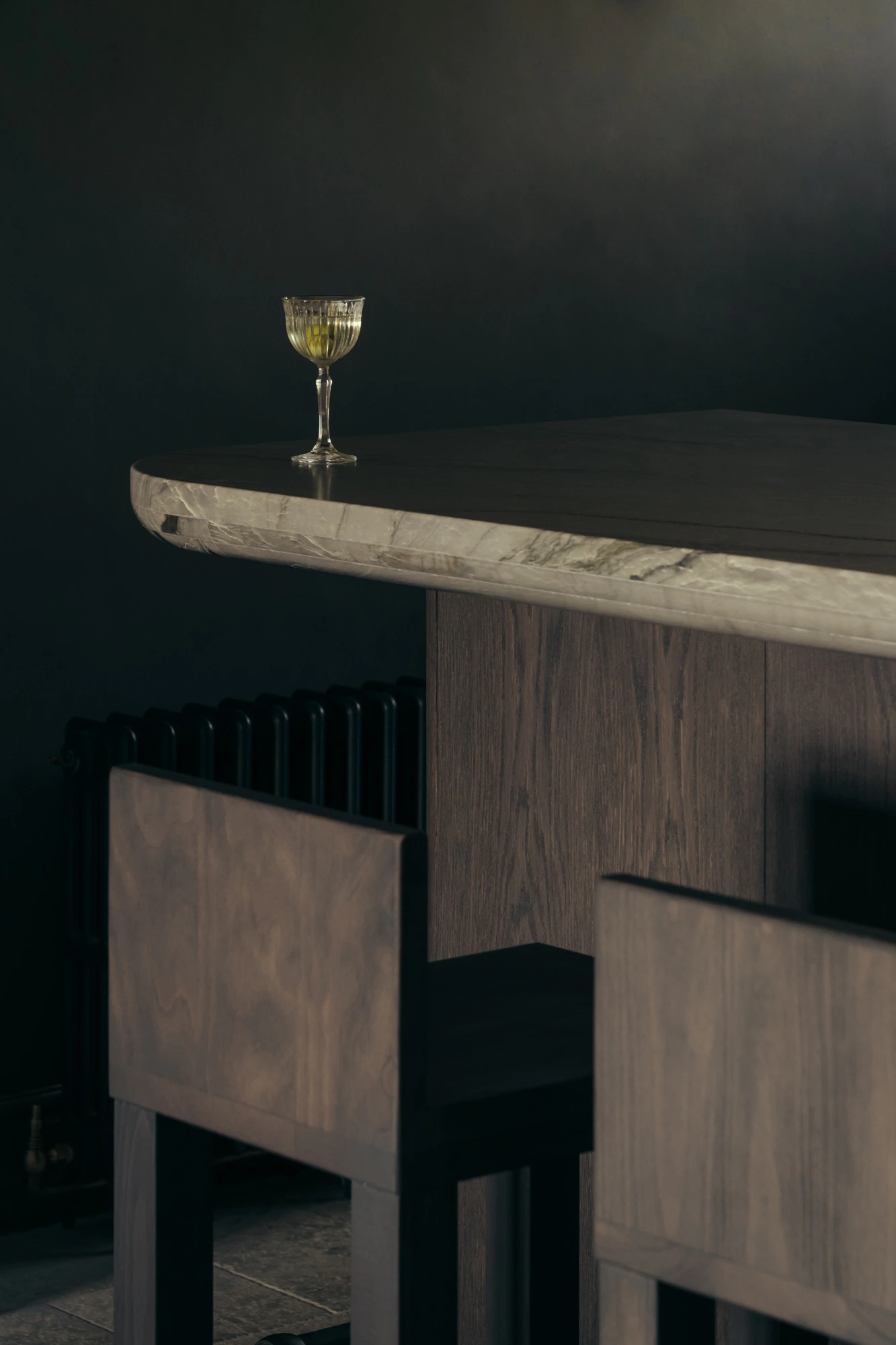 In this sophisticated and organic universe, Sensa Platino finds its place on the bar worktop, which serves cocktails, tea, coffee, and wines from around the world. The quartzite from the interior of Brazil, whose mineral formation brings a sense of purity, evokes the movement of ocean waves with its pattern. Its design perfectly complements the pronounced grain of the dark wood that supports it.