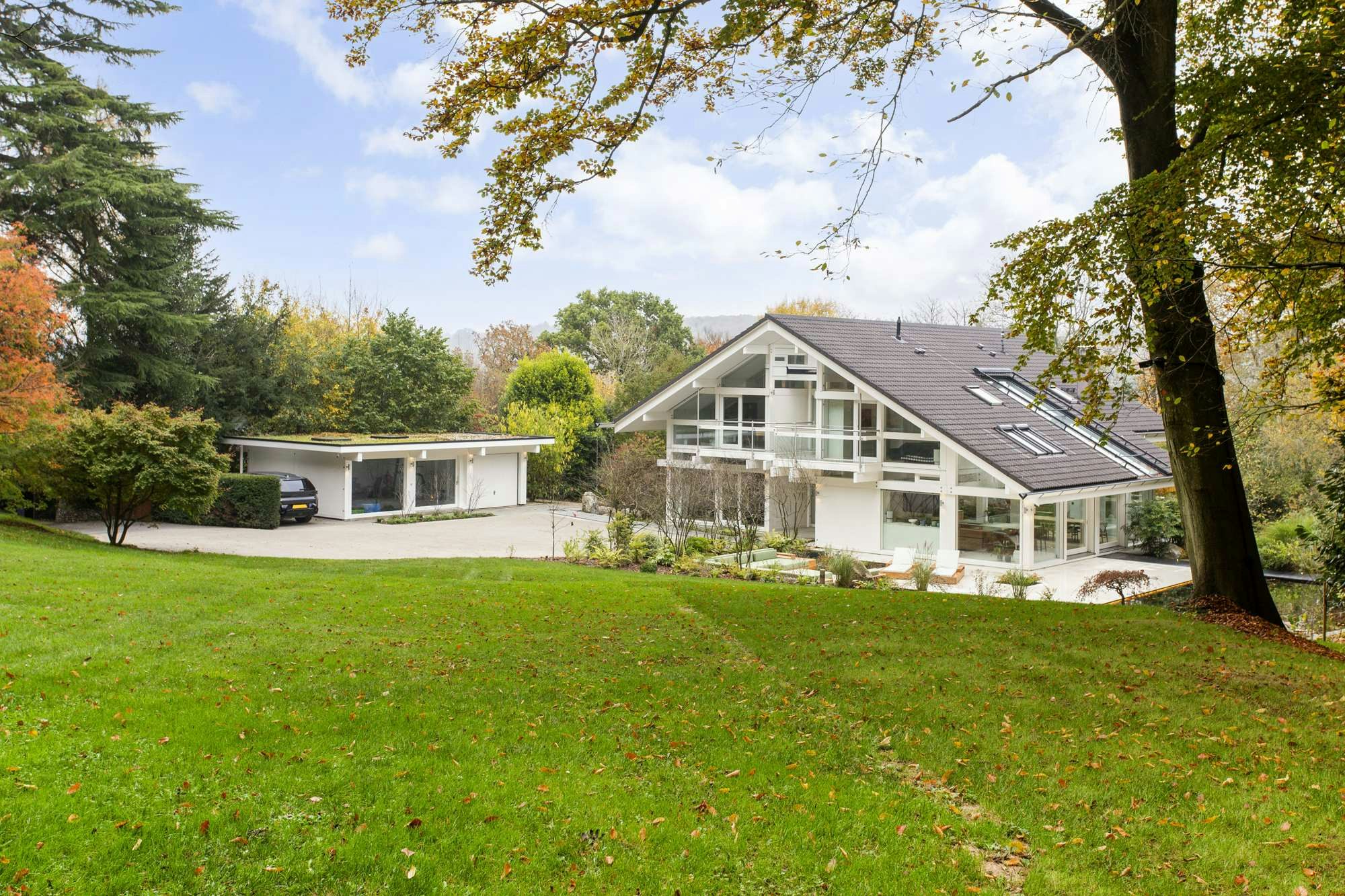 The extensive gardens surrounding the home, designed by Andy Sturgeon, Chelsea award winner, deserve recognition comparable to the design of the house itself. Designed to minimise the impact of the home on its rural surroundings, the garden boundaries are formed by a carefully curated selection of native boxwood and amelanchier, interspersed along the lawn edges with grasses, herbaceous plants, and a koi carp pond.